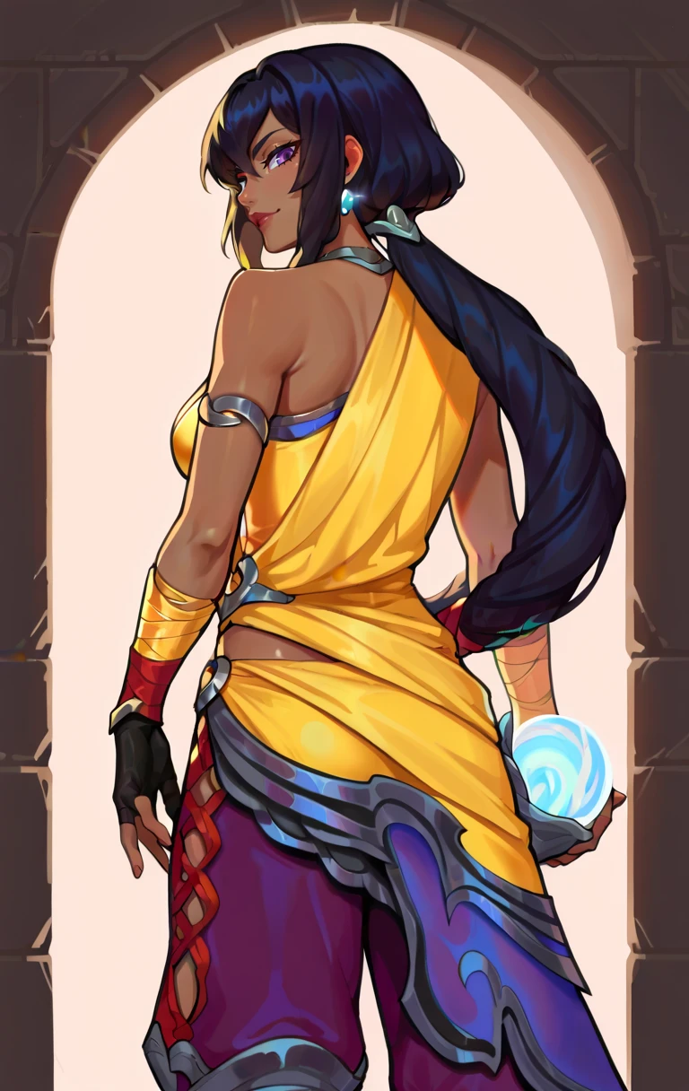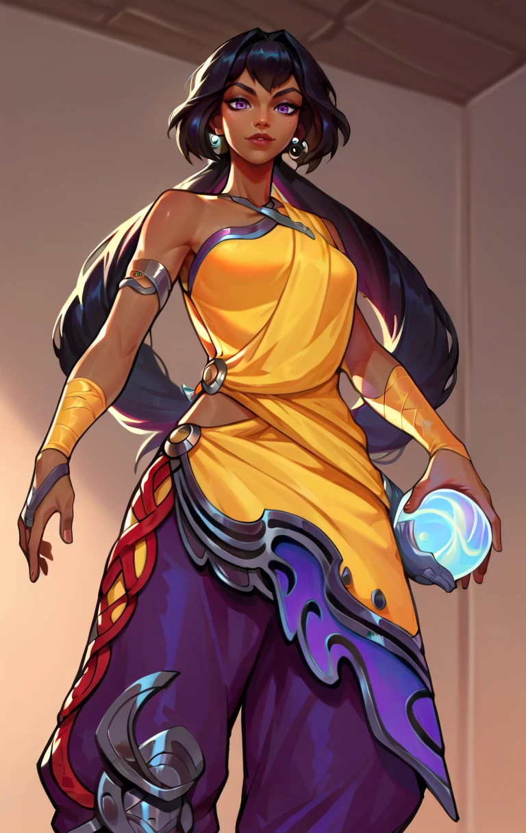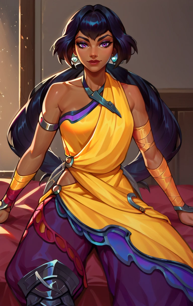 nilahSDXL,1girl,purple eyes,long hair,black hair,bare shoulders,jewelry,earrings,pants,dark skin,dark-skinned female,armor leg,vambraces,baggy pants
