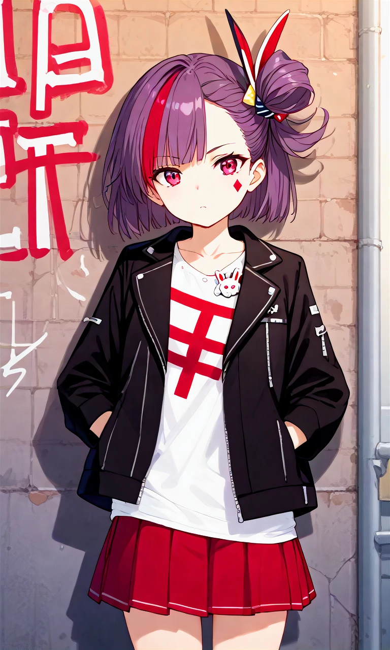 tenjin kotone, kotone punk, short hair, one side up, hair ornament, white shirt, black jacket, red skirt, pleated skirt, tied shirt