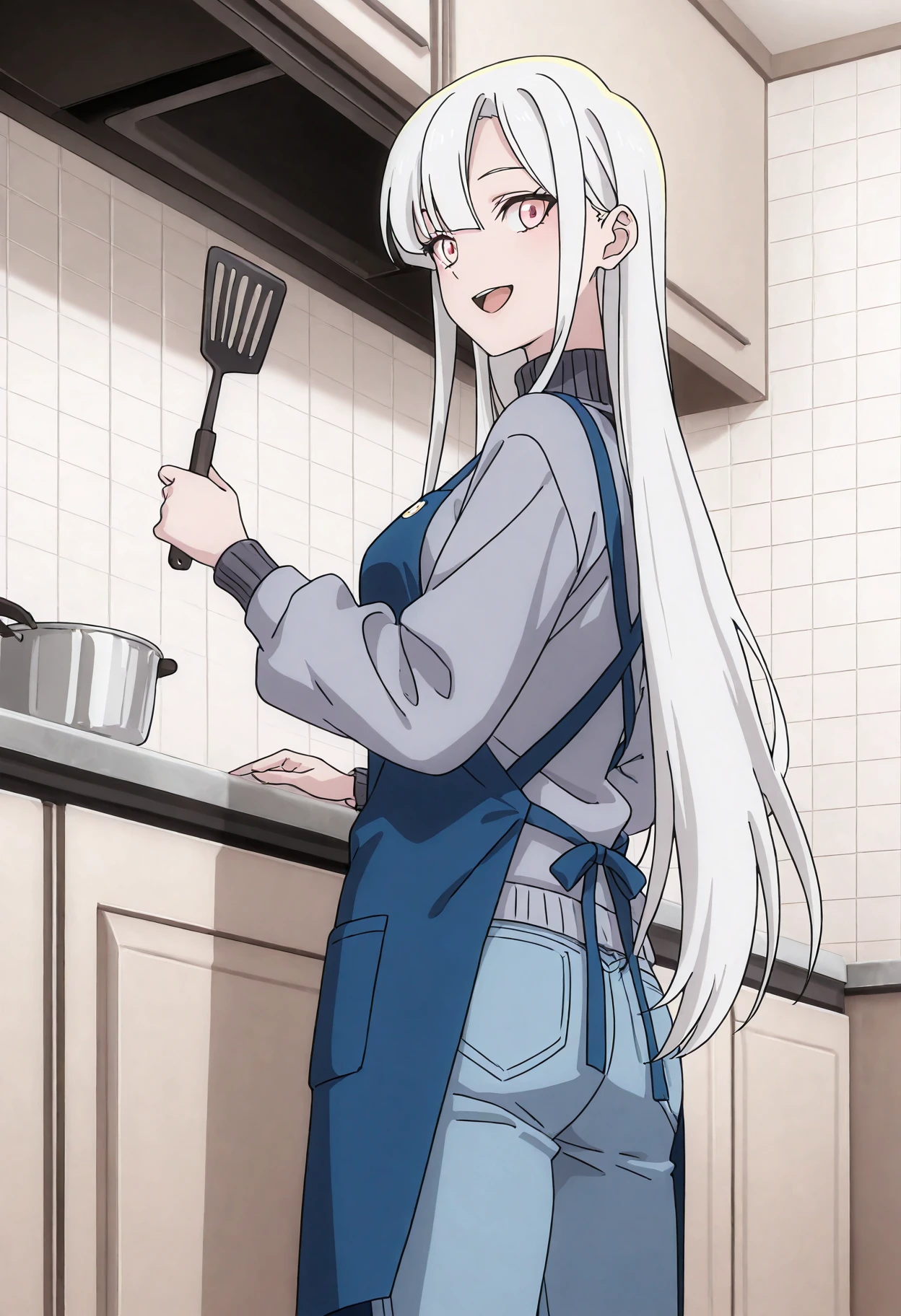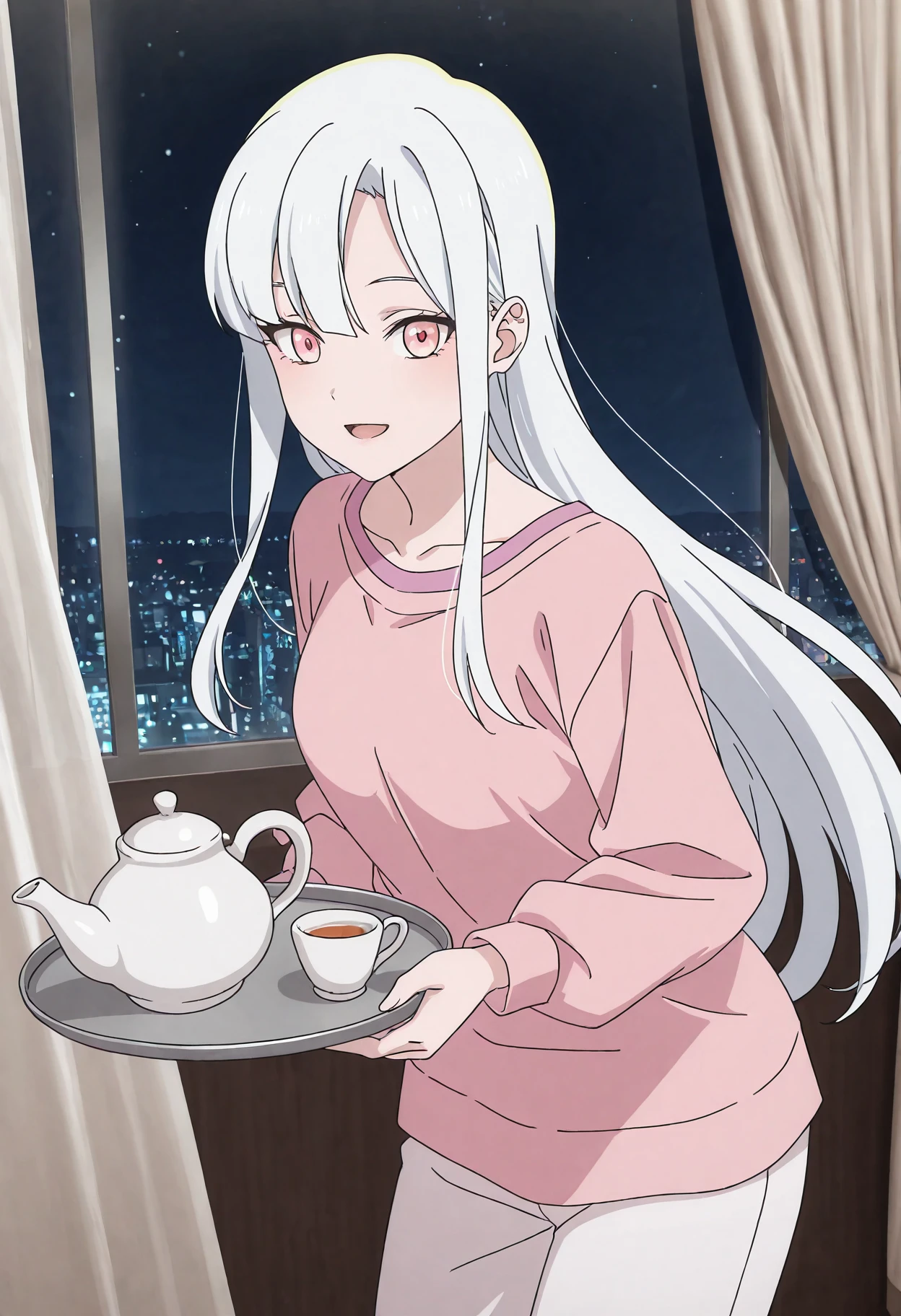 machinasoleige, long hair, asymmetrical bangs, white hair, pink eyes, breasts,