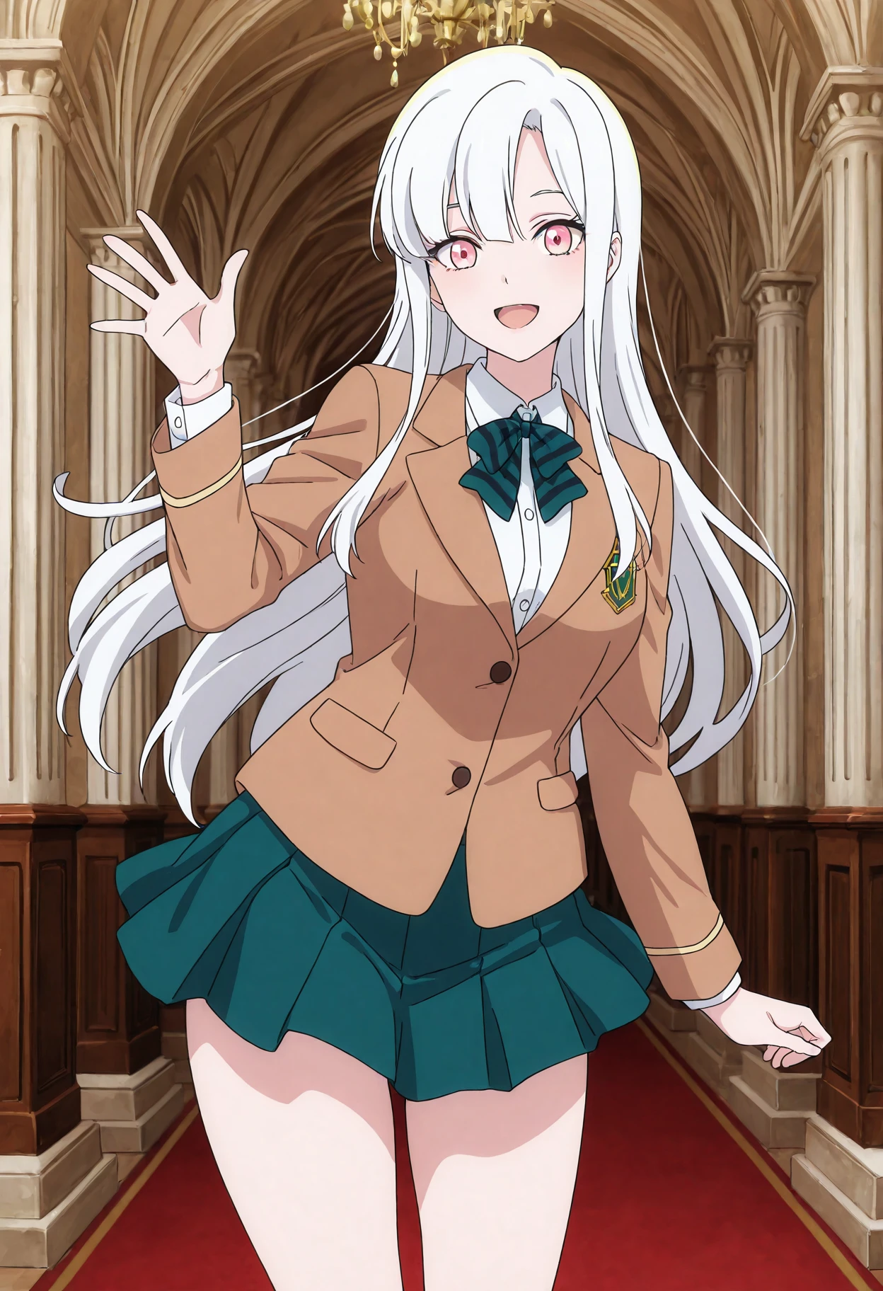 school uniform, brown blazer, collared shirt, white shirt, striped bowtie, green skirt, miniskirt,