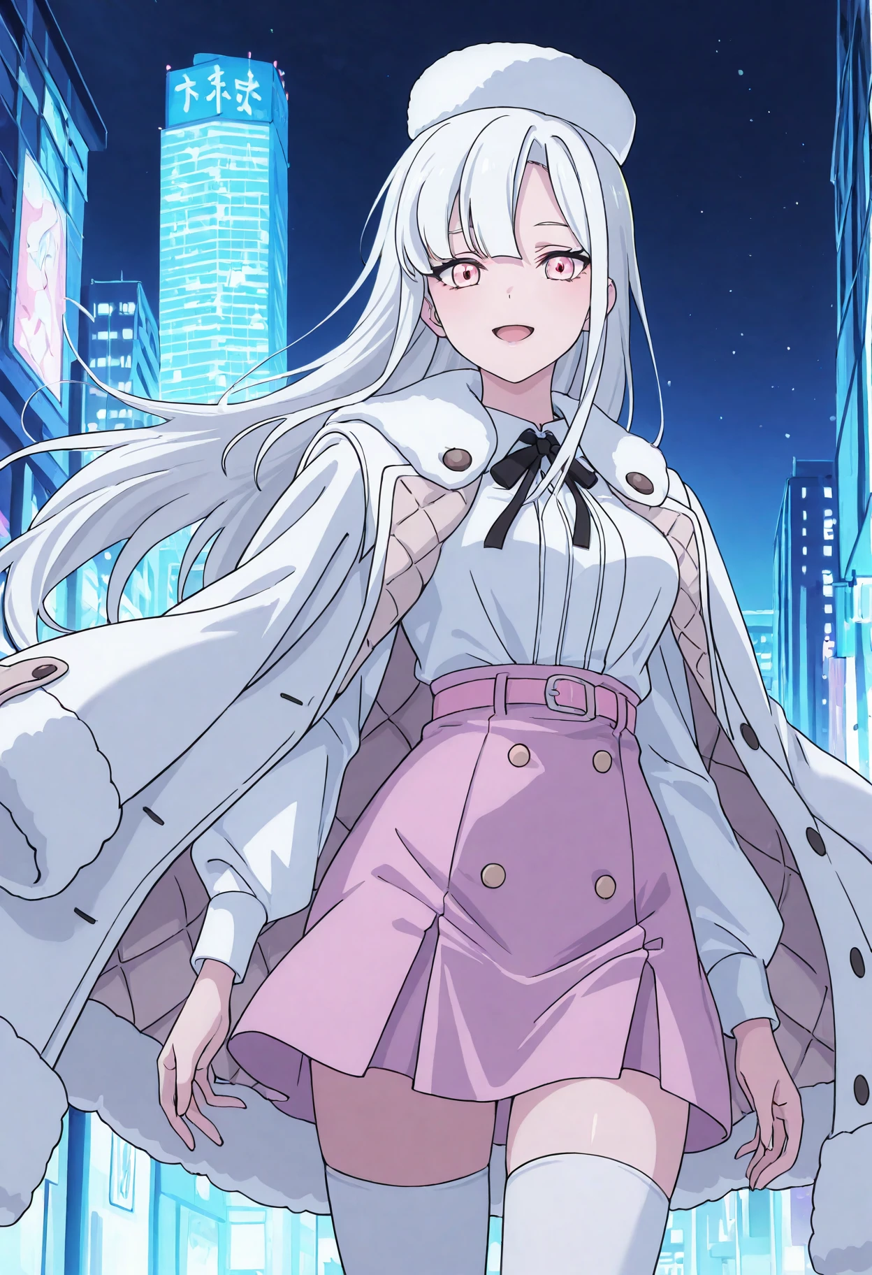 white coat, coat on shoulders, fur-trimmed coat, white blouse, pink belt, high-waist skirt, pink skirt, long sleeves, black ribbon, neck ribbon, fur hat, white hat, white thighhighs,