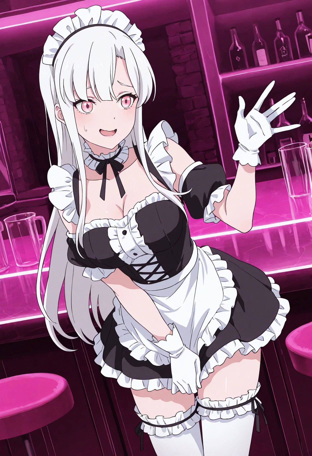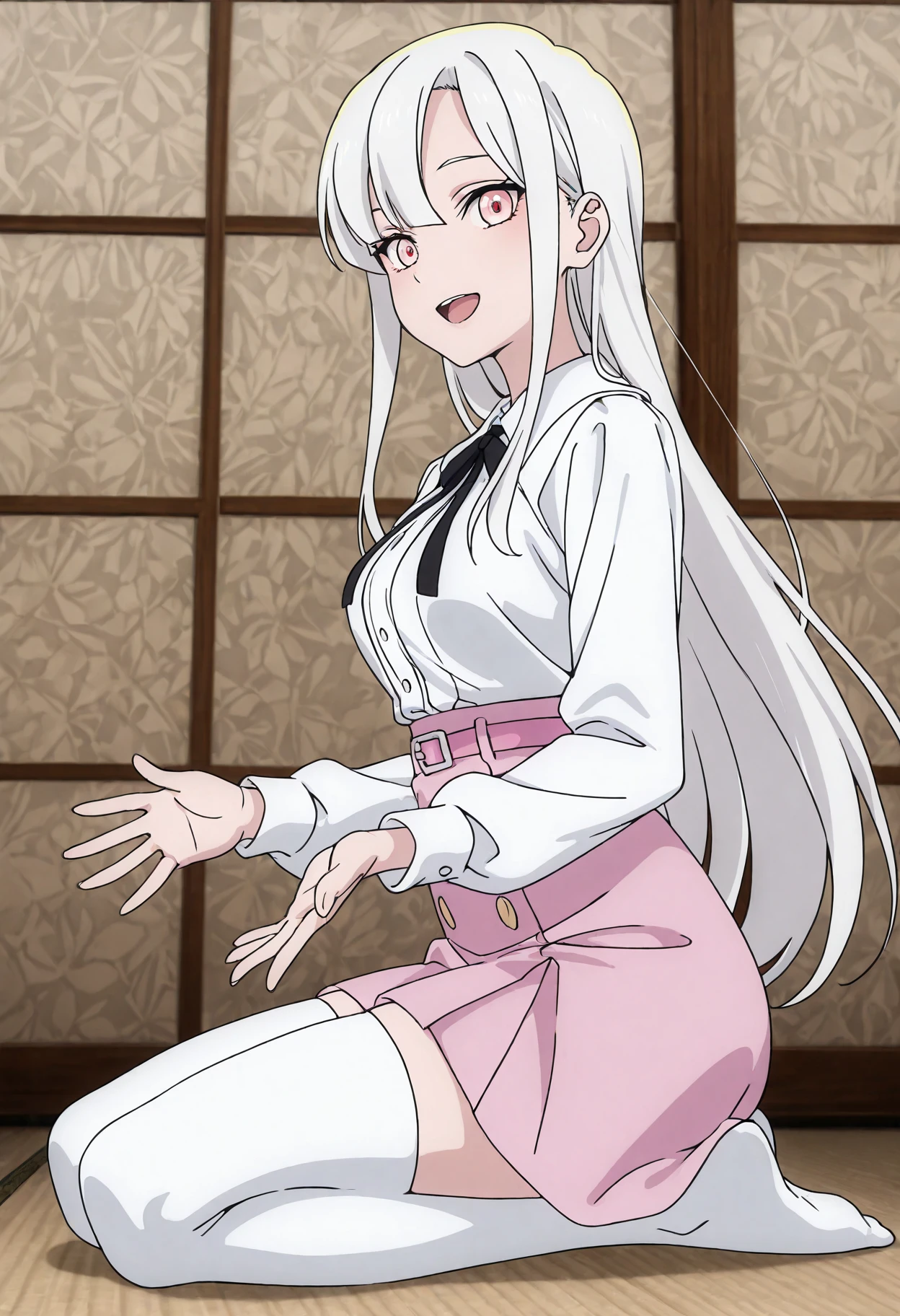 white blouse, pink belt, high-waist skirt, pink skirt, long sleeves, black ribbon, neck ribbon, white thighhighs, For full-body image / 全身見たい場合 / 全身圖用: