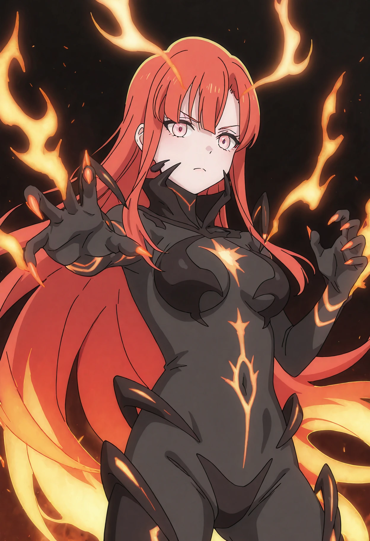 machinaonfire, absurdly long hair, asymmetrical bangs, fiery hair, red hair, pink eyes, breasts, black bodysuit, skin tight, claws, popped collar, long fingernails,
