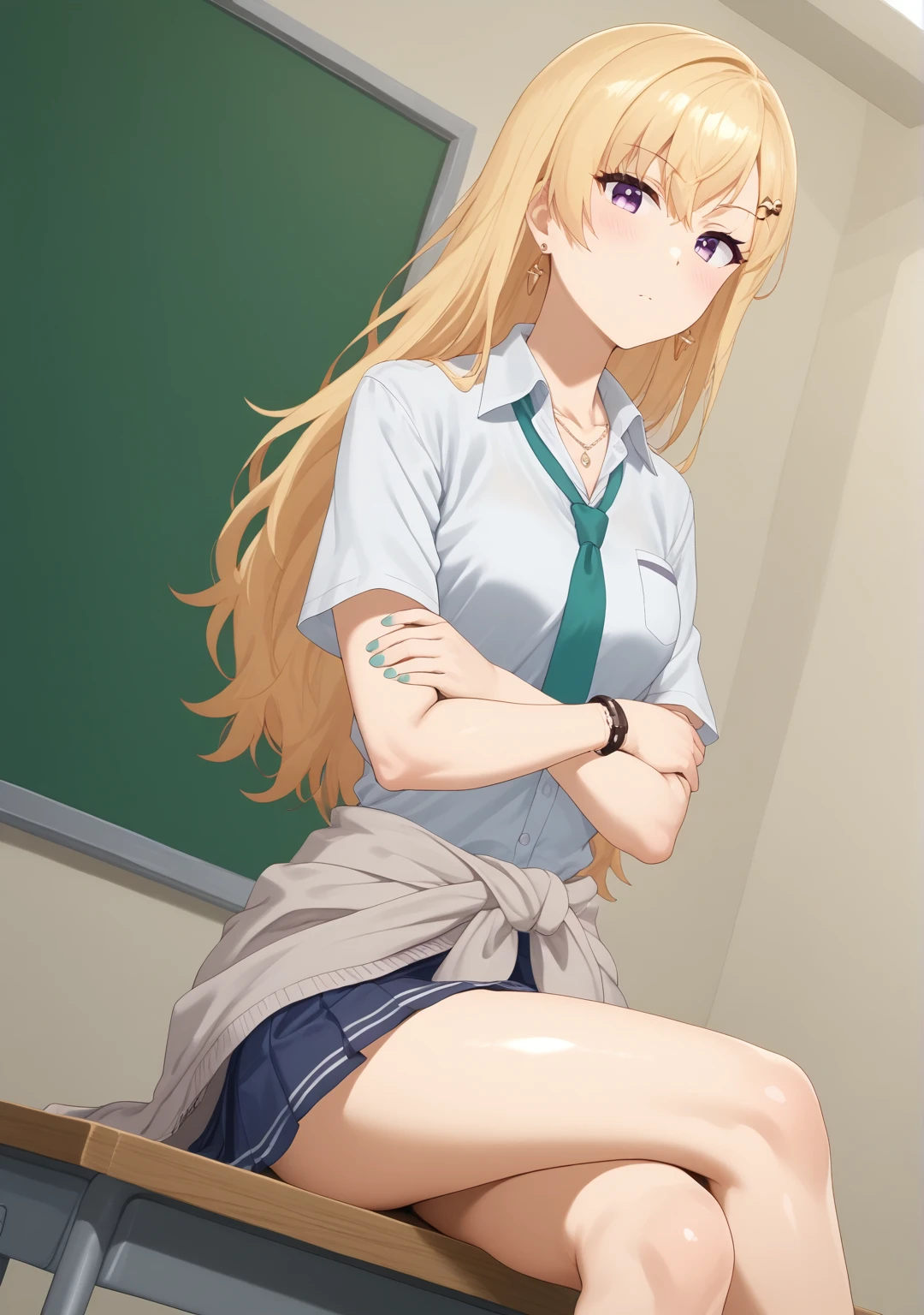 ```score_9, score_8_up, score_7_up, score_6_up, source_anime, Britfdb-FDBB, gyaru, 1girl, solo, blonde hiar. long hiar, hair ornament, hiar clips, (purple eyes), jewlry, earrings, necklace, bracelet, nail polish, school uniform, white shirt, short sleeves, collared shirt, green necktie, collarbone, clothes around waist, cardigan around waist, grey cardigan, blue skirt, pleated skirt`````score_4, score_5, score_6, source_furry, negativeXL_D,(worst quality, low quality, not detailed, low resolution, bad ???????, ugly face:1.21)``ENJOY !!