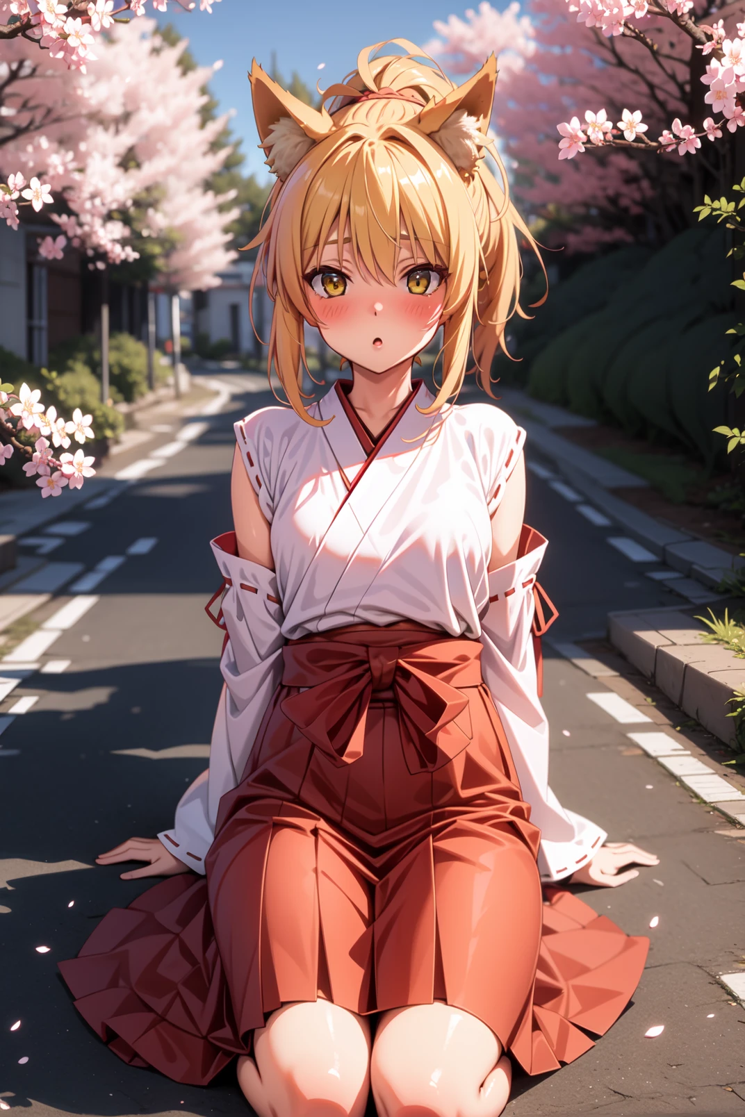 outfit: miko, japanese clothes, wide sleeves, ribbon-trimmed sleeves, red bow, red hakama, red hakama skirt