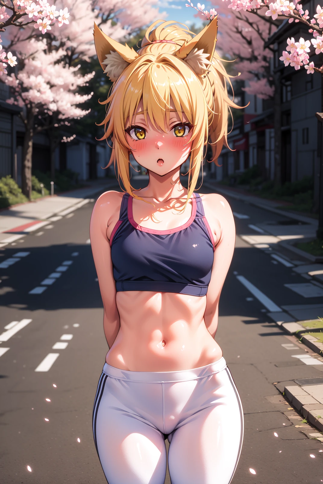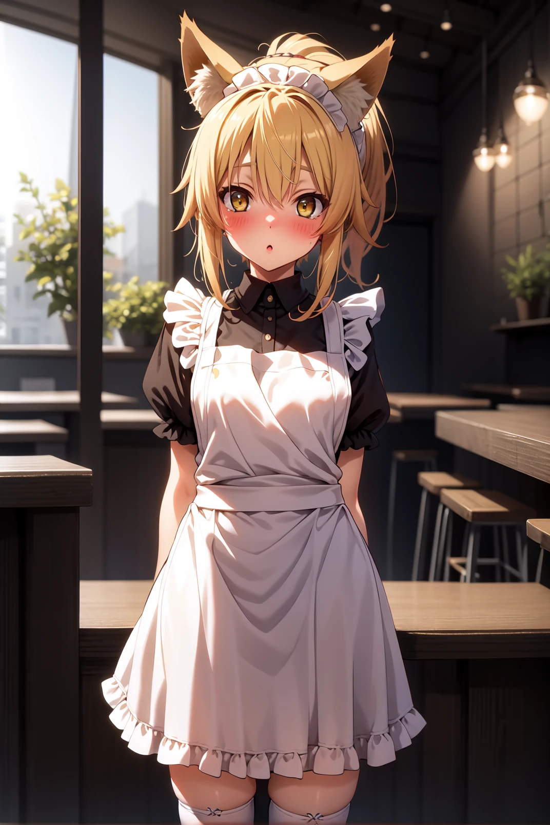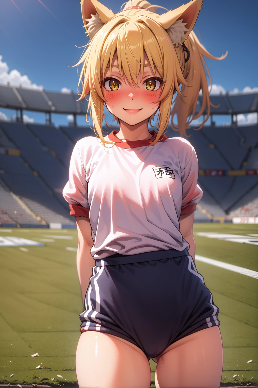 appearace: kunou, yellow eyes, blonde hair, long hair, ponytail, fox ears, fox tail, multiple tails