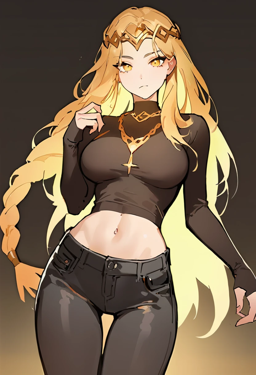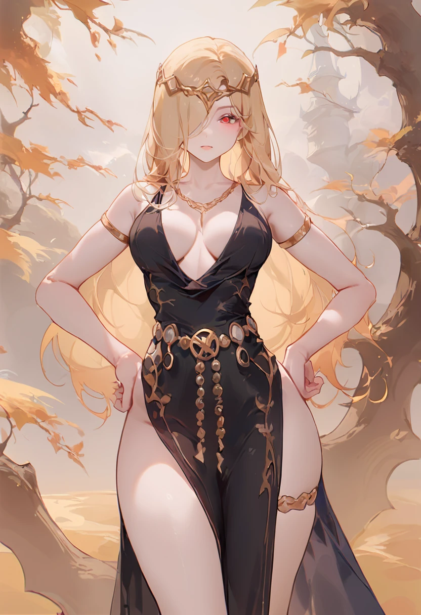 Trigger word:1girl,black dress with gold details,deep v-neckline,gold crown,gold necklace,gold armlets,gold bracelets,gold chain belt,gold chain accessories on legs,golden eyes,braided blonde hair