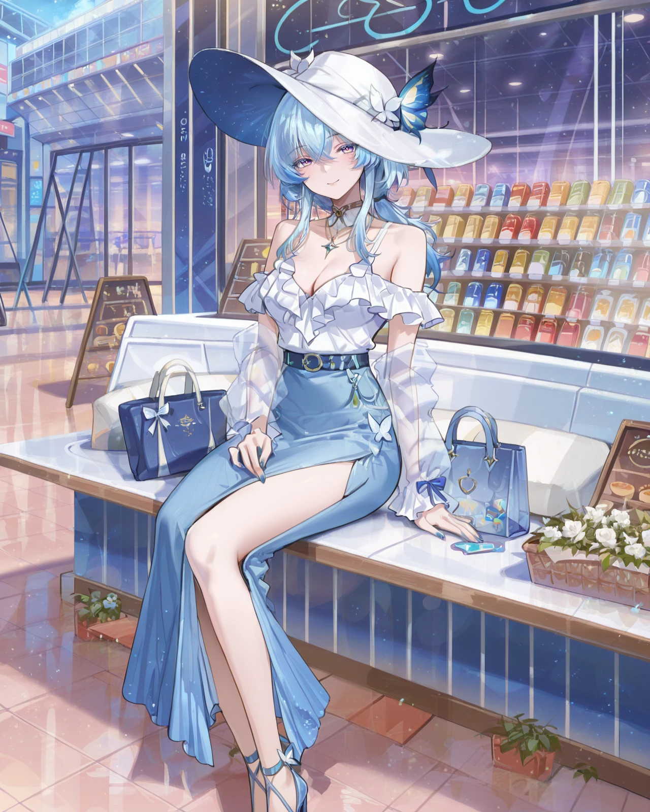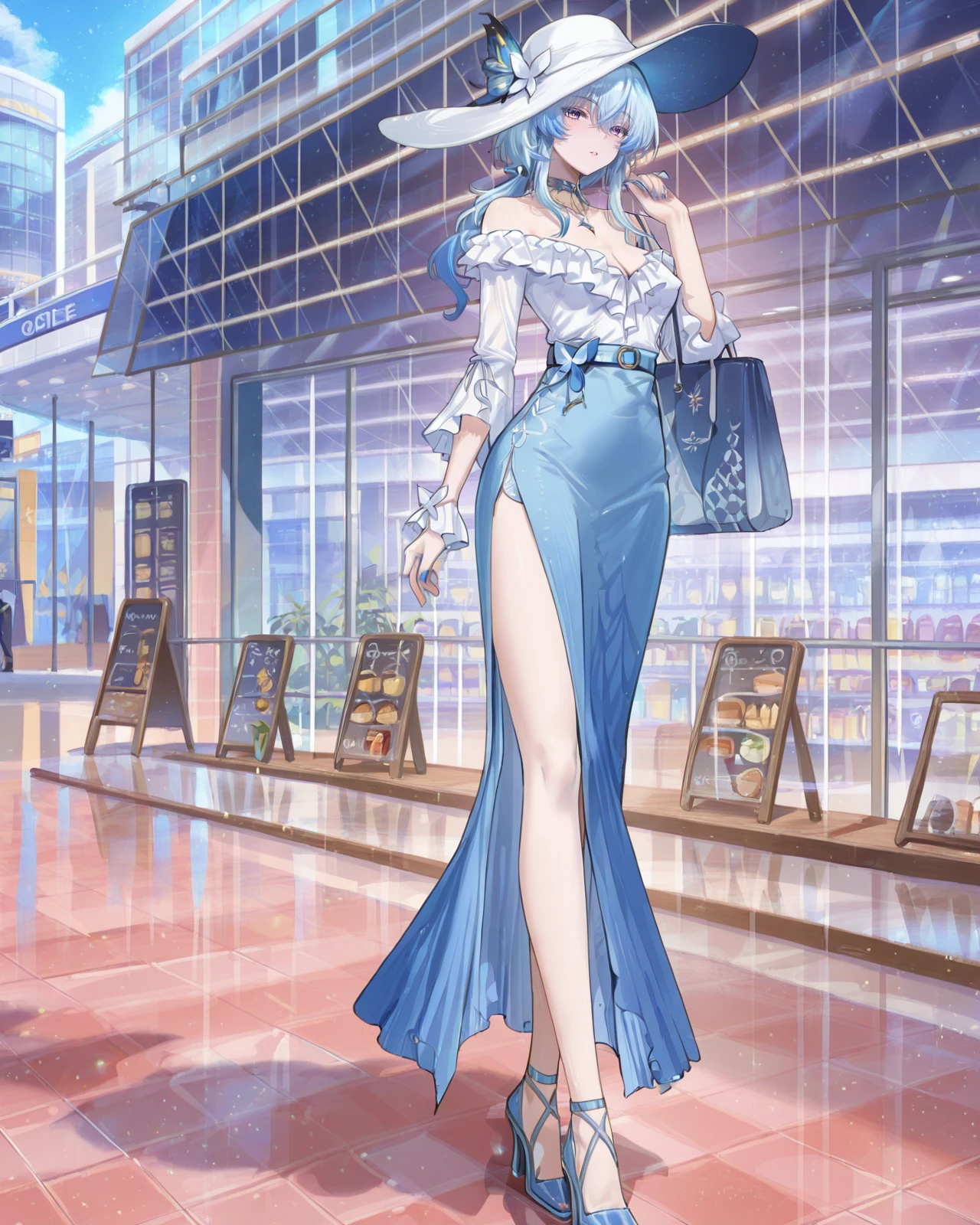 low ponytail, cleavage, jewelry, ???? shoulders, white shirt, sidelocks, belt, off shoulder, necklace, nail polish, high heels, blue skirt, detached collar, white headwear, white flower, blue ribbon, frilled sleeves, blue nails, side slit, long skirt, blue footwear, sun hat, shoulder bag, butterfly hair ornament, hat flower, off-shoulder shirt, strappy heels, ankle strap, frilled shirt