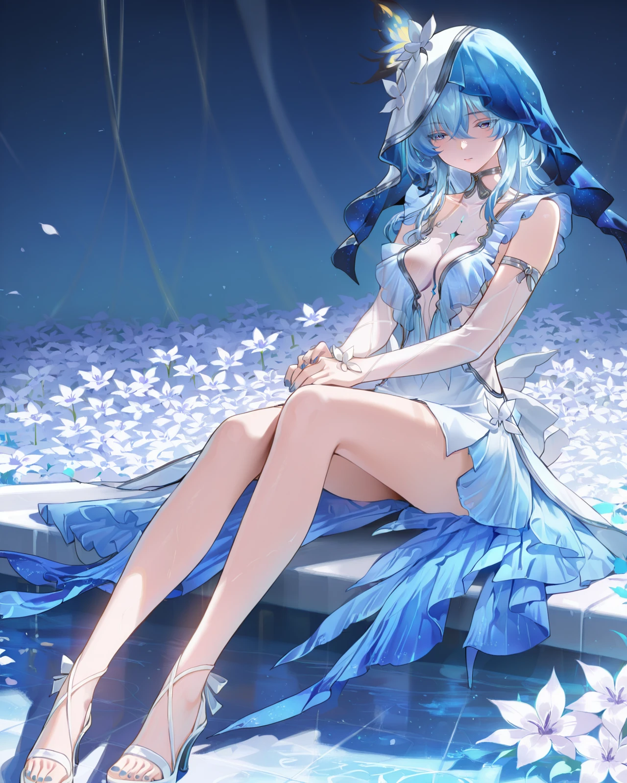pleated skirt, detached sleeves, cleavage, white dress, nail polish, high heels, collar, blue skirt, sleeveless dress, detached collar, blue dress, white headwear, white footwear, short dress, white flower, white bow, veil, blue nails, armlet, toenail polish, hat flower, white collar, strappy heels, white veil
