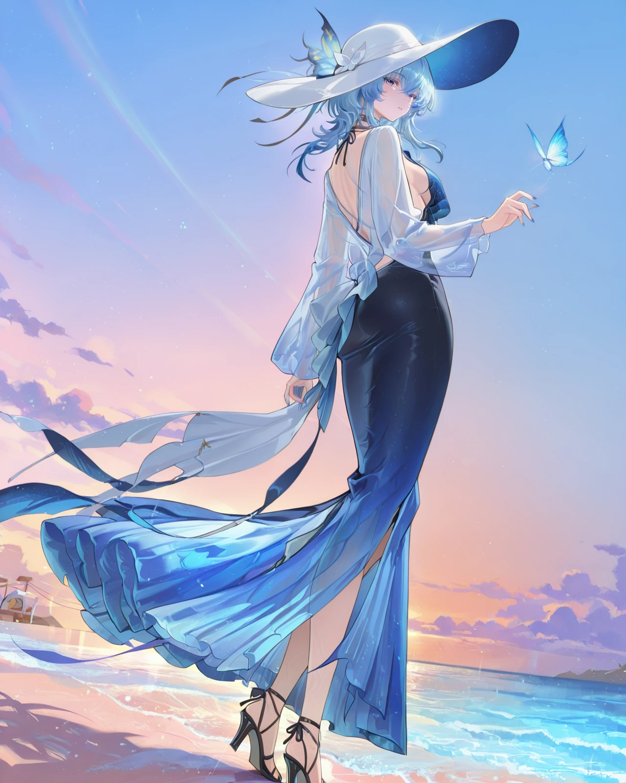 long sleeves, dress, hat, ribbon, black footwear, black dress, high heels, see-through, blue dress, white headwear, halterneck, white jacket, blue nails, crossed bangs, sun hat,backless outfit, long dress, backless dress, ????????????, strappy heels, evening gown, gradient dress