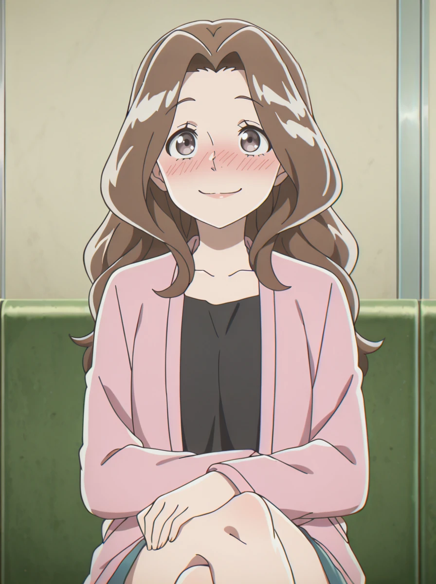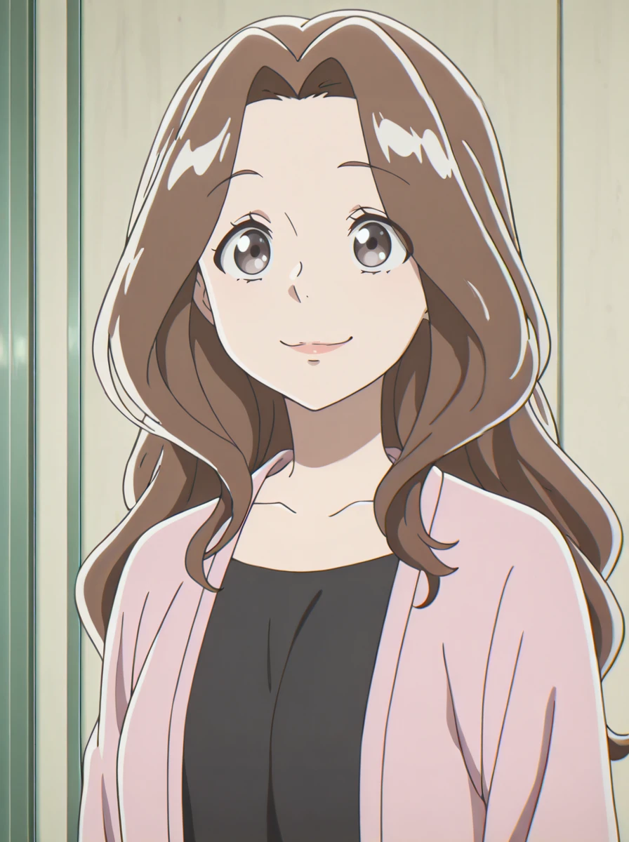 Main Look: kanaemaekawaillust, brown hair, long hair, 1girl, solo, smile pink_blazer