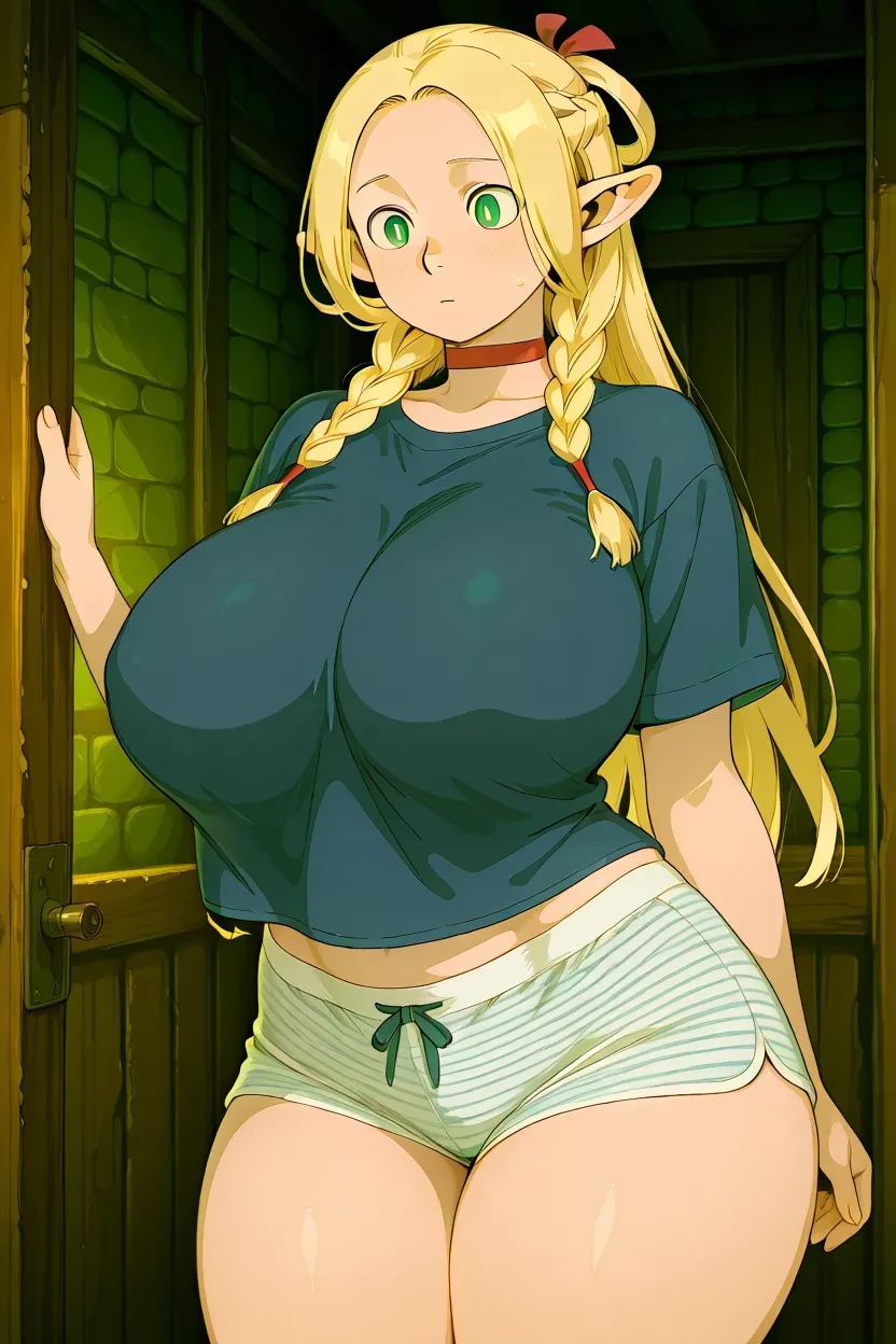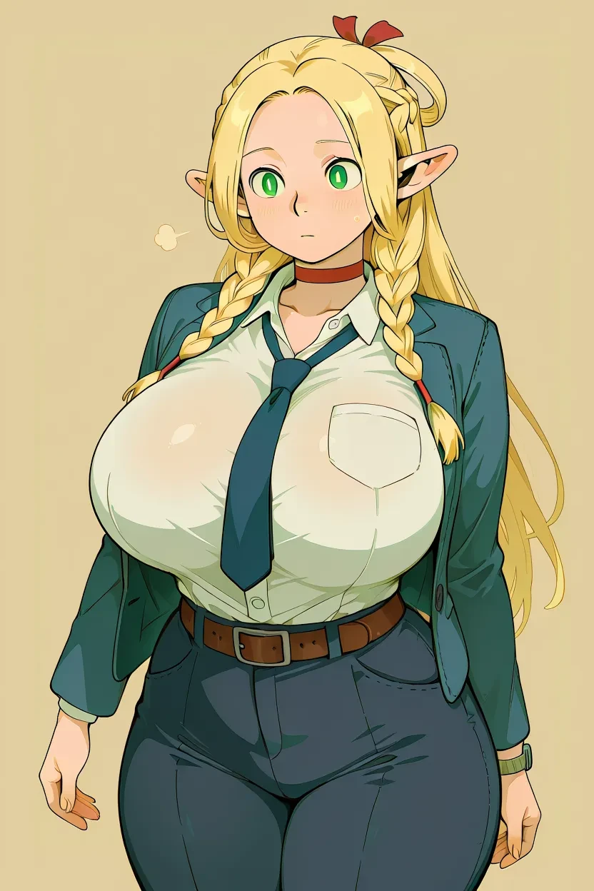 1girl, Marcille Donato, elf, blonde_hair, green_eyes, braid, long_hair, pointy_ears, twin_braids, lips, huge breasts, Delicious in Dungeon_art_style, HD, Hi-res, 4k, excellent quality, masterpiece