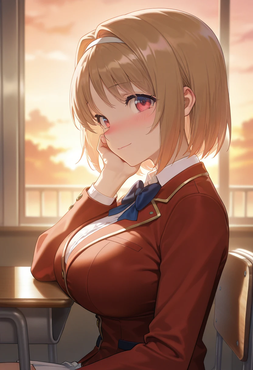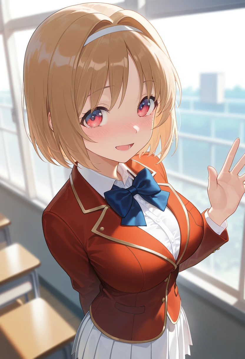 Tags for her outfit: school uniform, red jacket, white shirt, pleated skirt, hairband, blue bow, blazer, white skirt, blue bowtie,