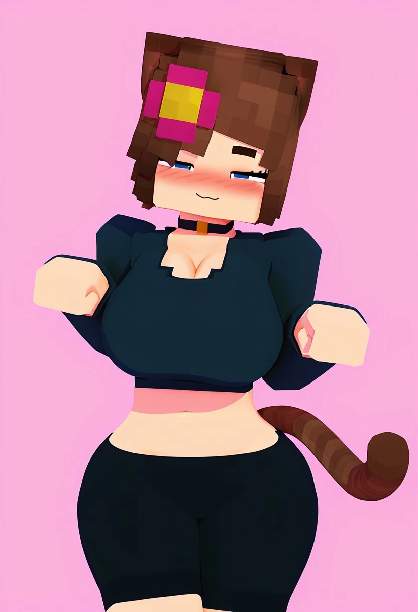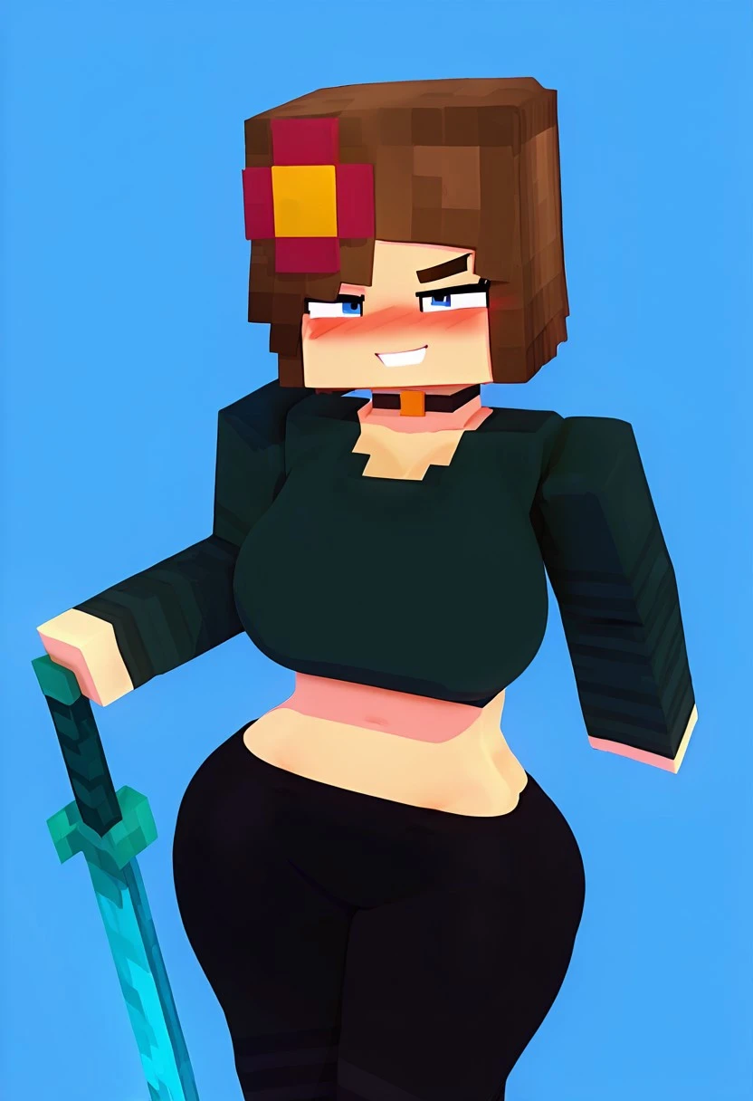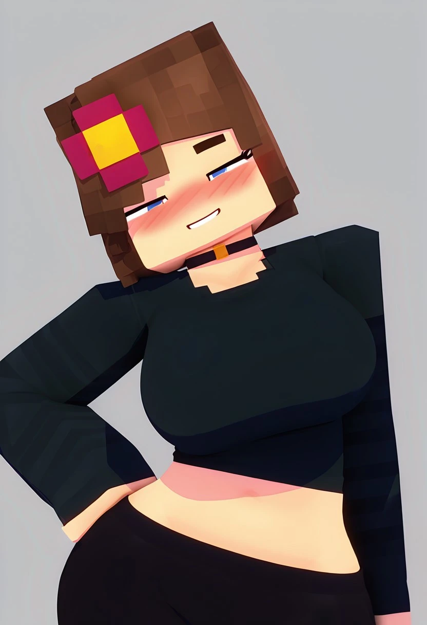 jennymc, 1girl, brown hair, solo, short hair, blunt bangs, hair ornament, blue eyes, black choker, large breasts, blush, long sleeves, black shirt, midriff, wide hips, 3d,