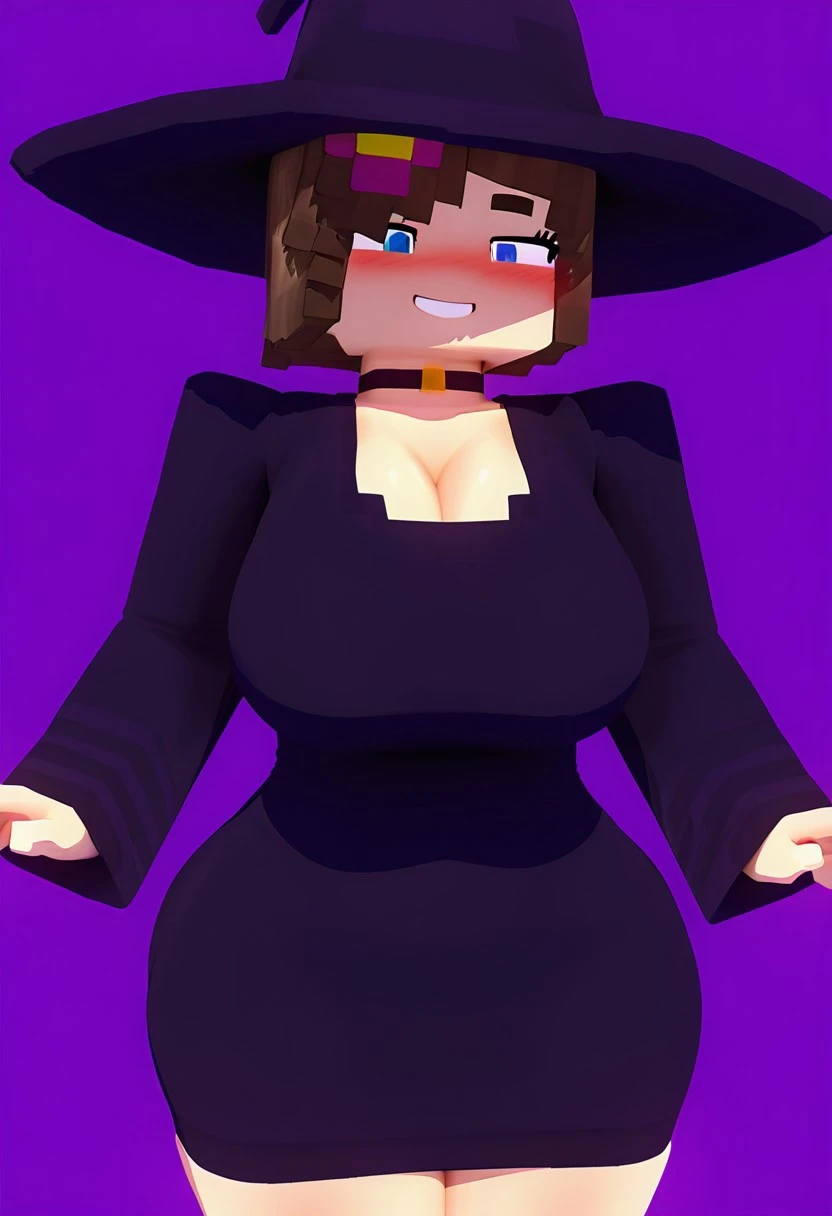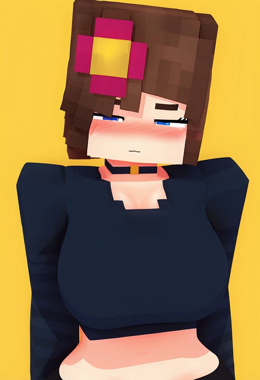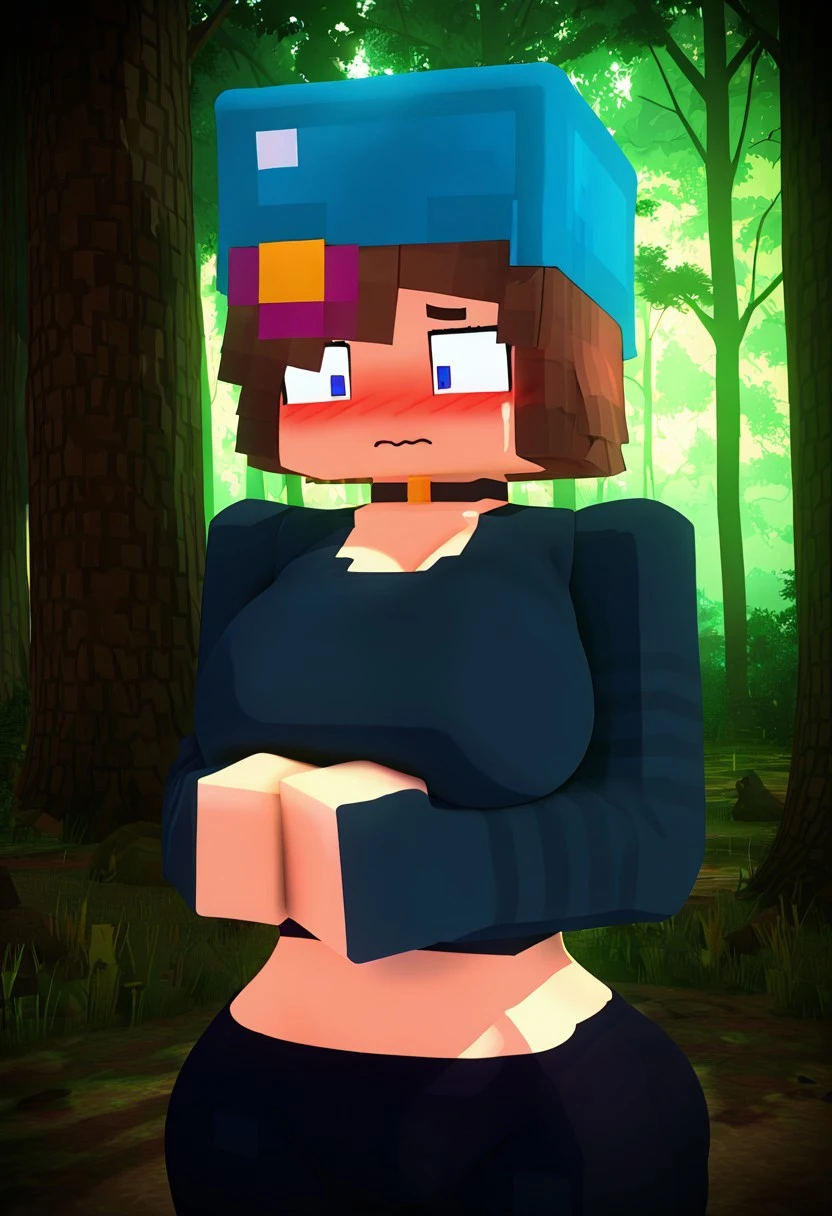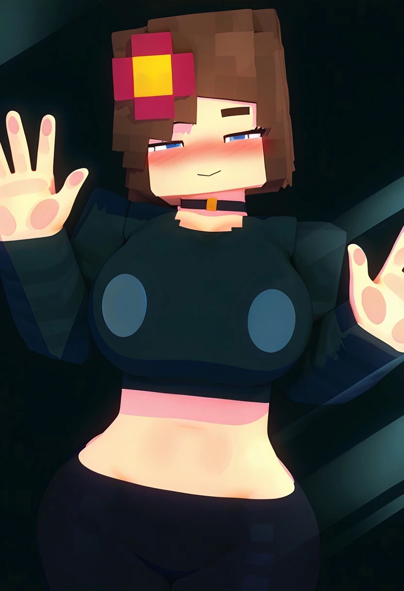 jennymc, 1girl, brown hair, solo, short hair, blunt bangs, hair ornament, blue eyes, black choker, large breasts, blush, long sleeves, black shirt, midriff, wide hips, 3d,