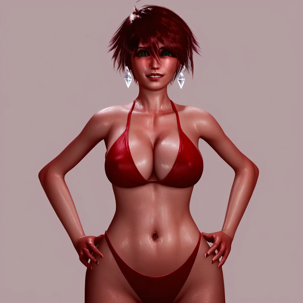 1girl, Katty, short hair, red hair, vibrant red hair (vibrant:1.2), green eyes, mole under eye, large breasts, big ass,
