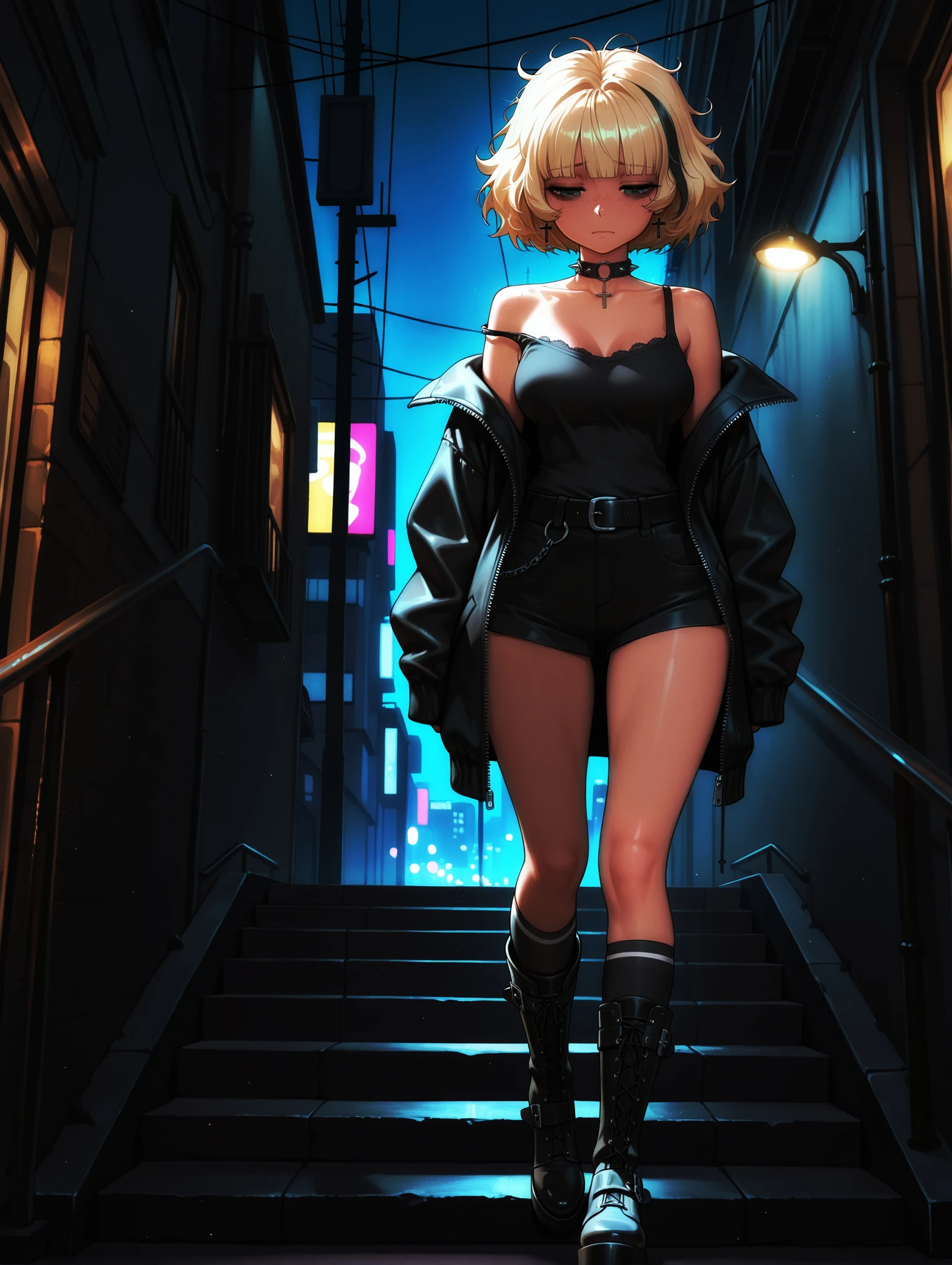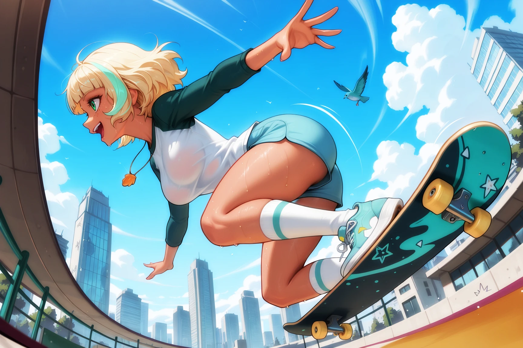 Optional Prompts : body freckles, short shorts, mole under eye, dark-skinned female