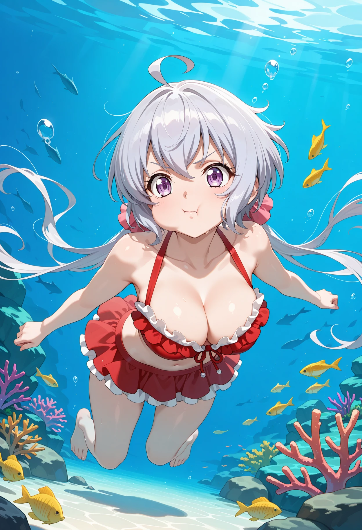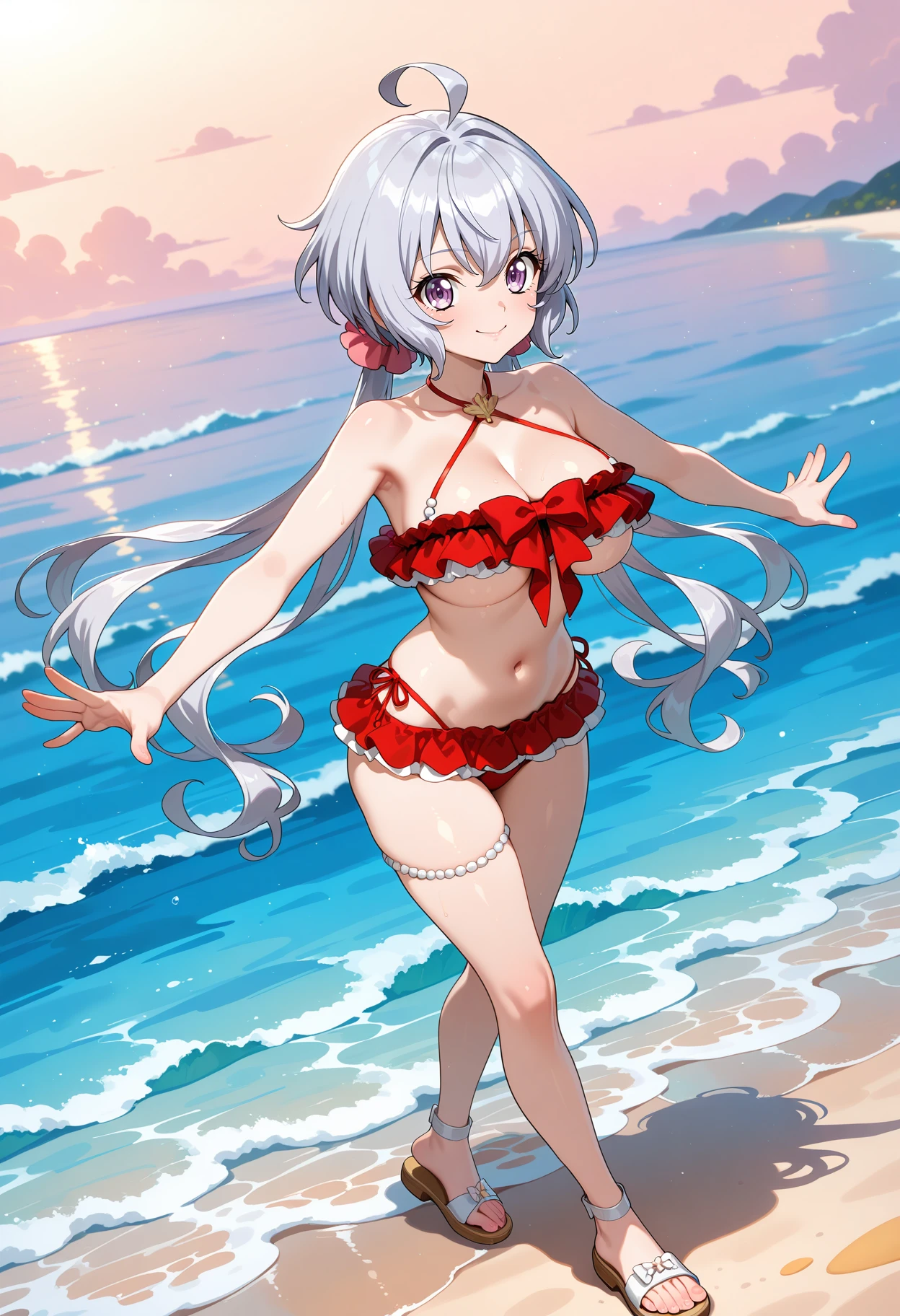 outfit9aachris, long hair, grey hair, low twintails, hair scrunchie, ahoge, criss-cross halter, cleavage, red bow, frilled bikini, red bikini, underboob, thigh strap