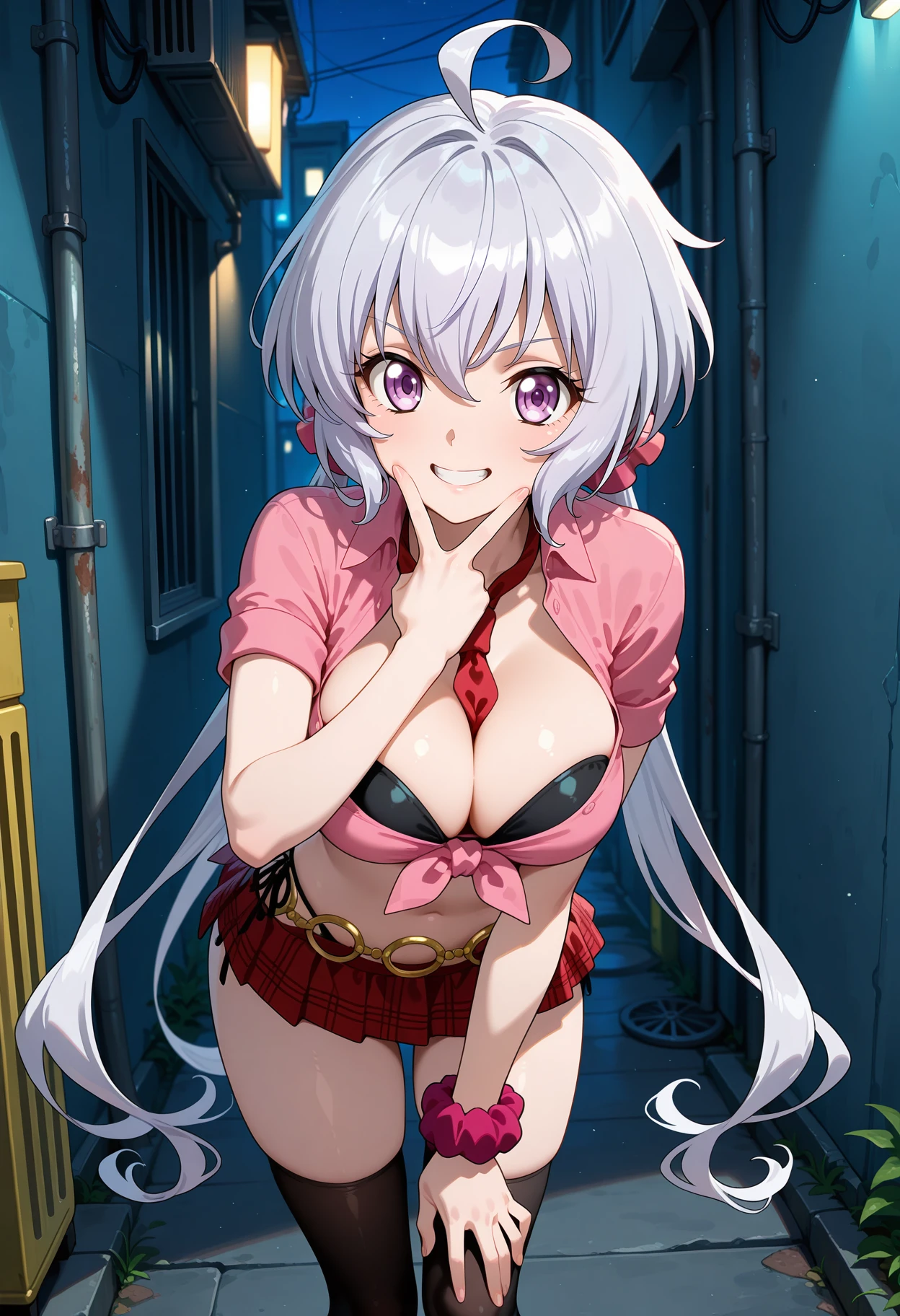 outfit8aachris, long hair, grey hair, low twintails, hair scrunchie, ahoge, red necktie, cleavage, black bikini, tied shirt, pink shirt, short sleeves, wrist scrunchie, midriff, o-ring belt, microskirt, plaid skirt, red skirt, side-tie bikini bottom, black thighhighs,
