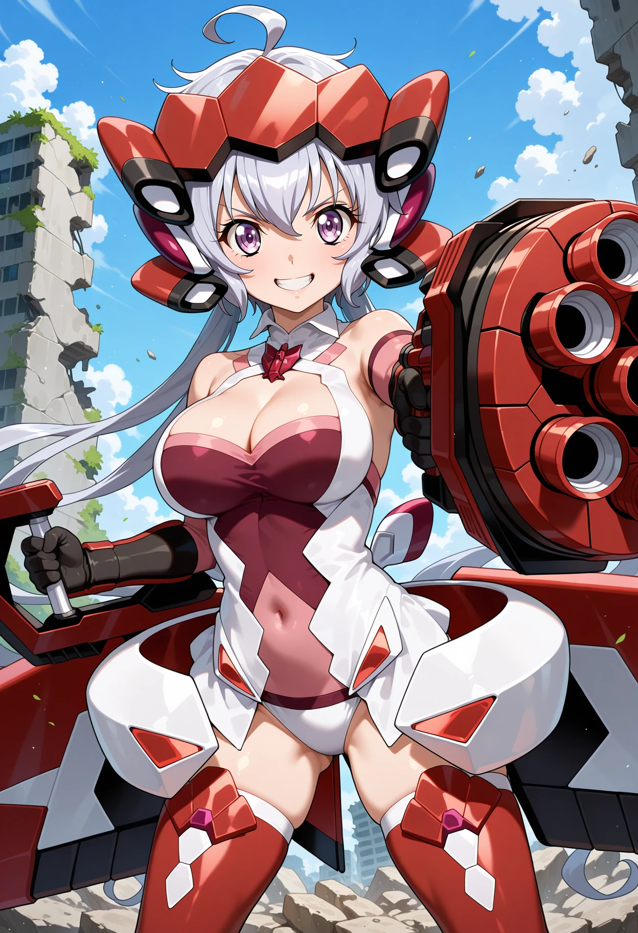 outfit2 (Symphogear AXZ Suit)bbchris, long hair, grey hair, low twintails, ahoge, headgear, mecha musume, cleavage cutout, leotard, bodysuit, arm guards, elbow gloves, covered navel, red thighhighs, thigh boots
