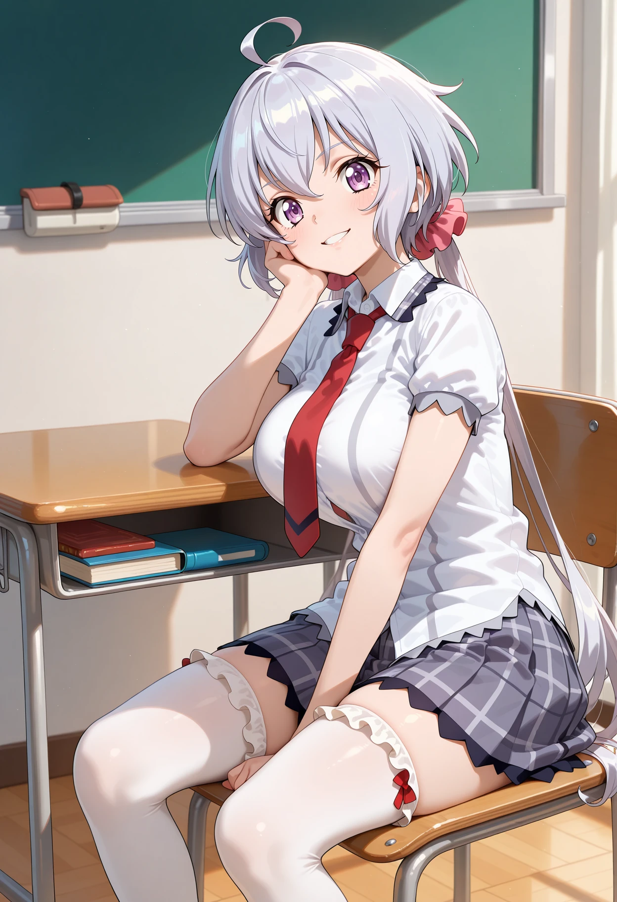 outfit1-2aachris, long hair, grey hair, low twintails, hair scrunchie, ahoge, school uniform, red necktie, untucked shirt, collared shirt, white shirt, short sleeves, plaid skirt, grey skirt, white thighhighs