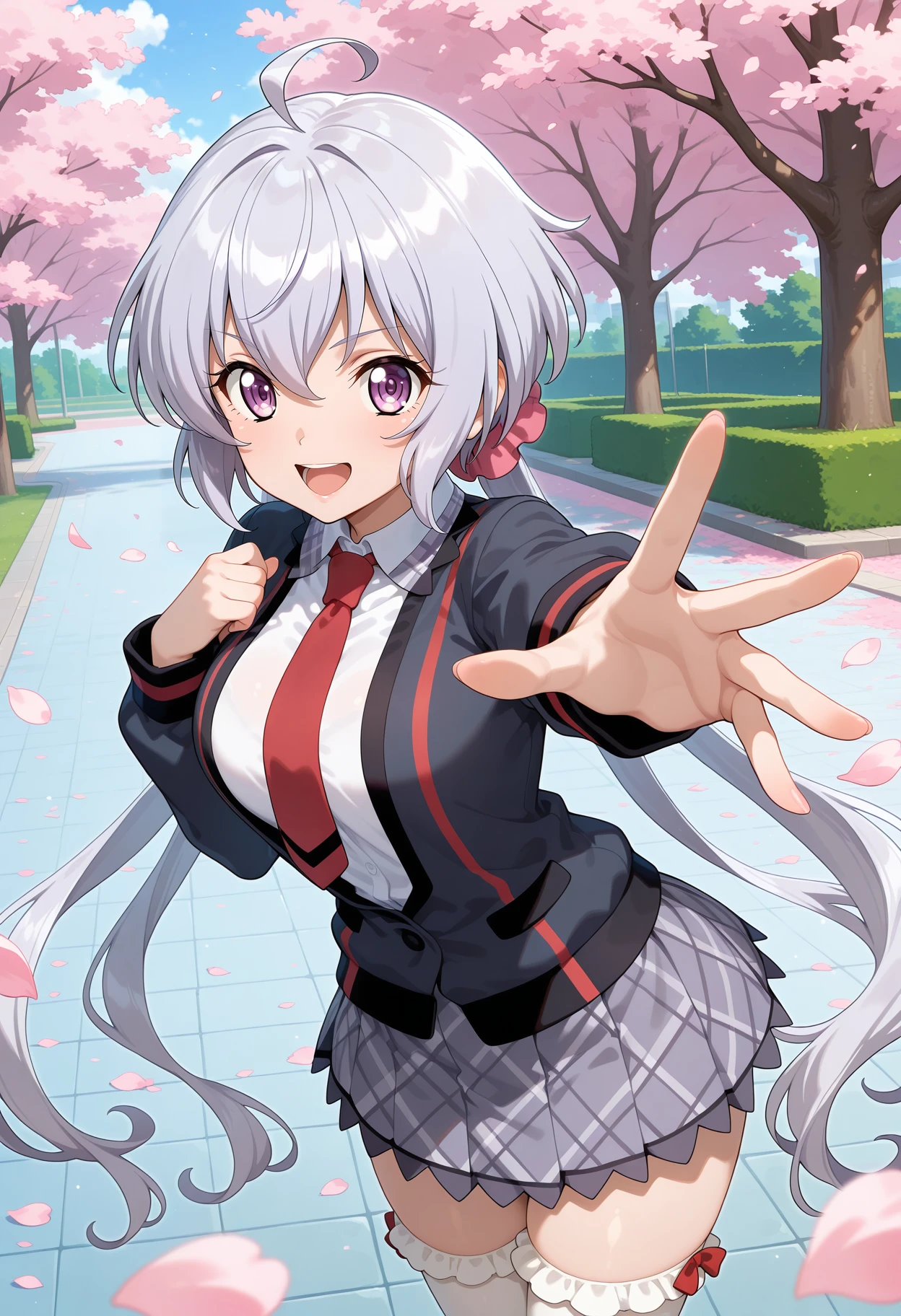 outfit1-1aachris, long hair, grey hair, low twintails, hair scrunchie, ahoge, school uniform, red necktie, collared shirt, white shirt, blazer, black jacket, long sleeves, plaid skirt, grey skirt, white thighhighs