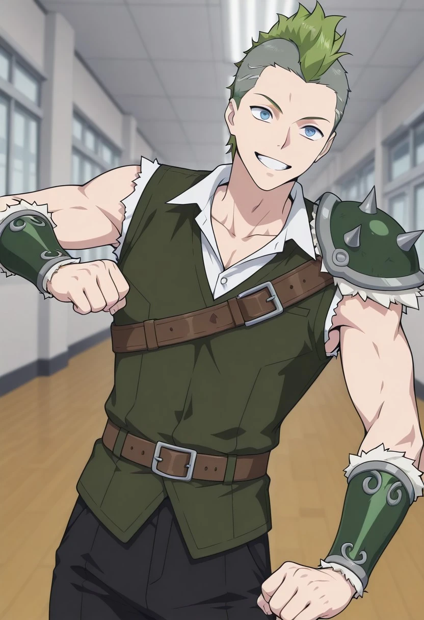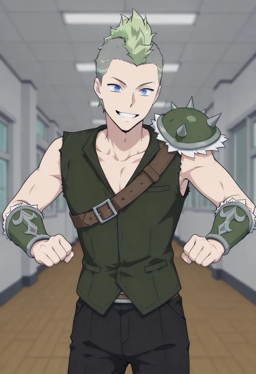 green vest, ripped sleeves, green bracers with white fur trim, green spiky shoulder armor with white fur trim, black pants, brown shoulder belt, sleeveless, asymmetrical armor,