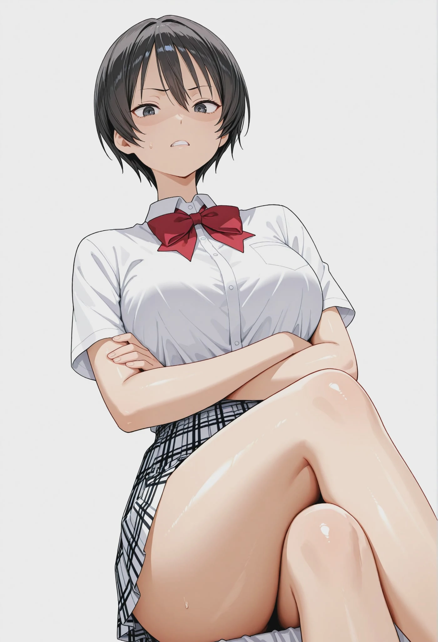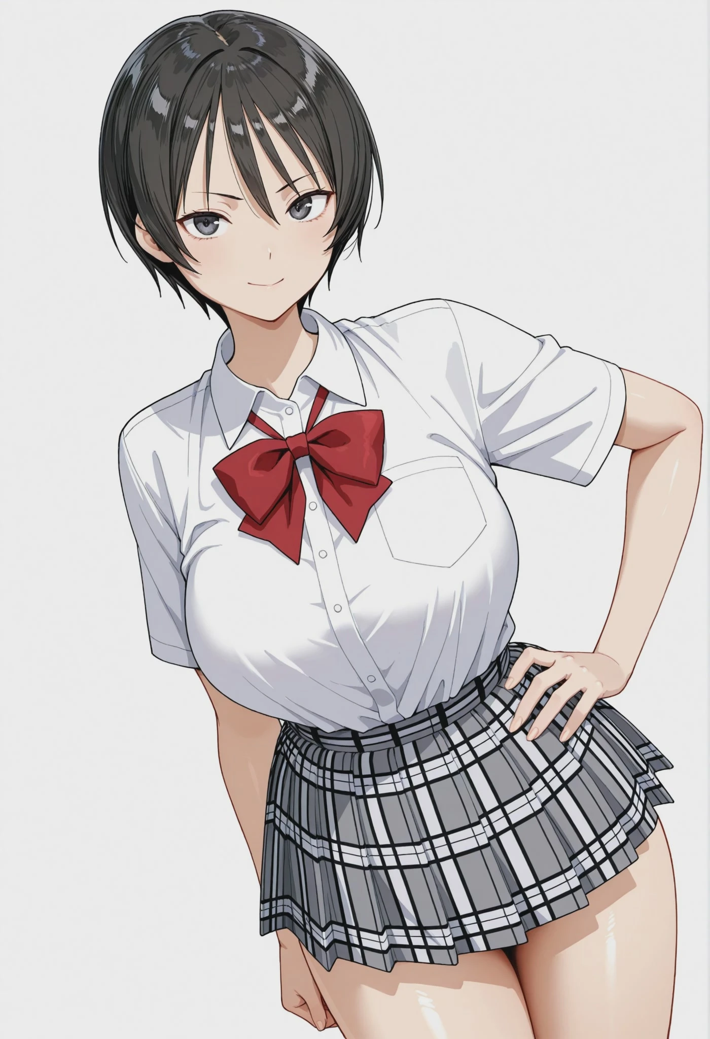 • school_uniform, white shirt, collared shirt, red bowtie, pleated skirt, mini skirt,
