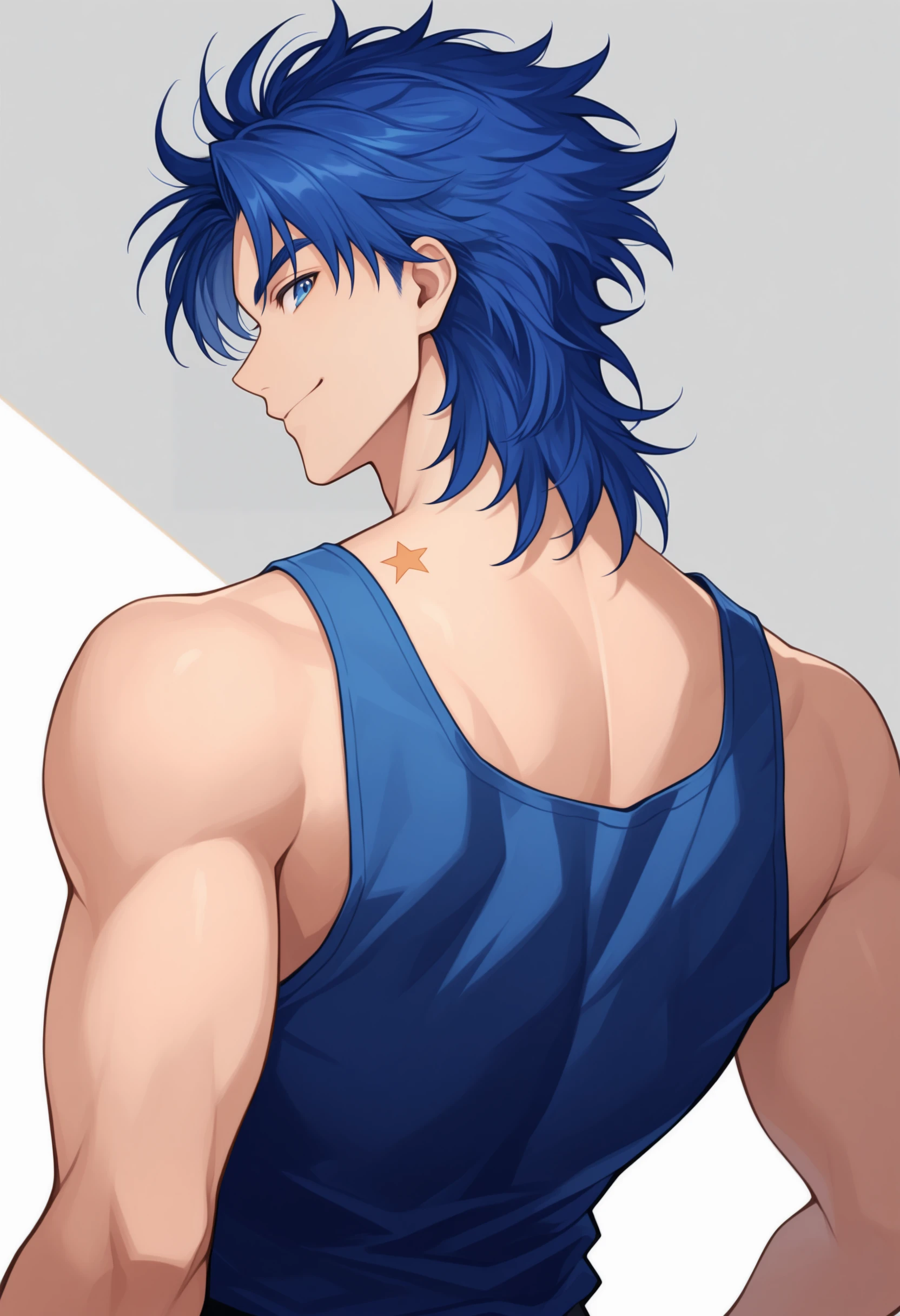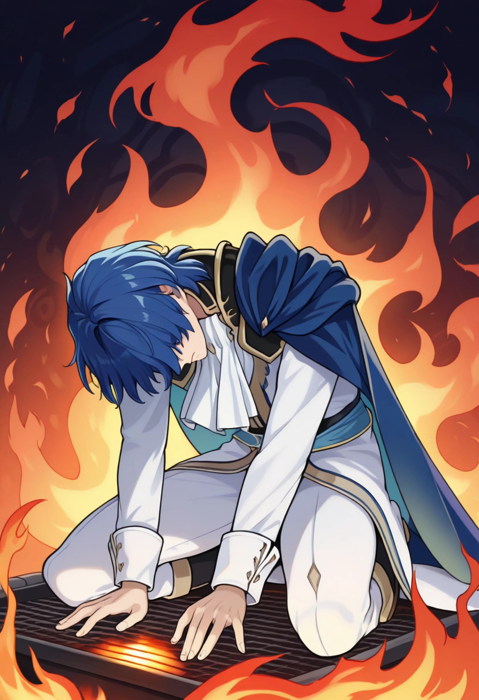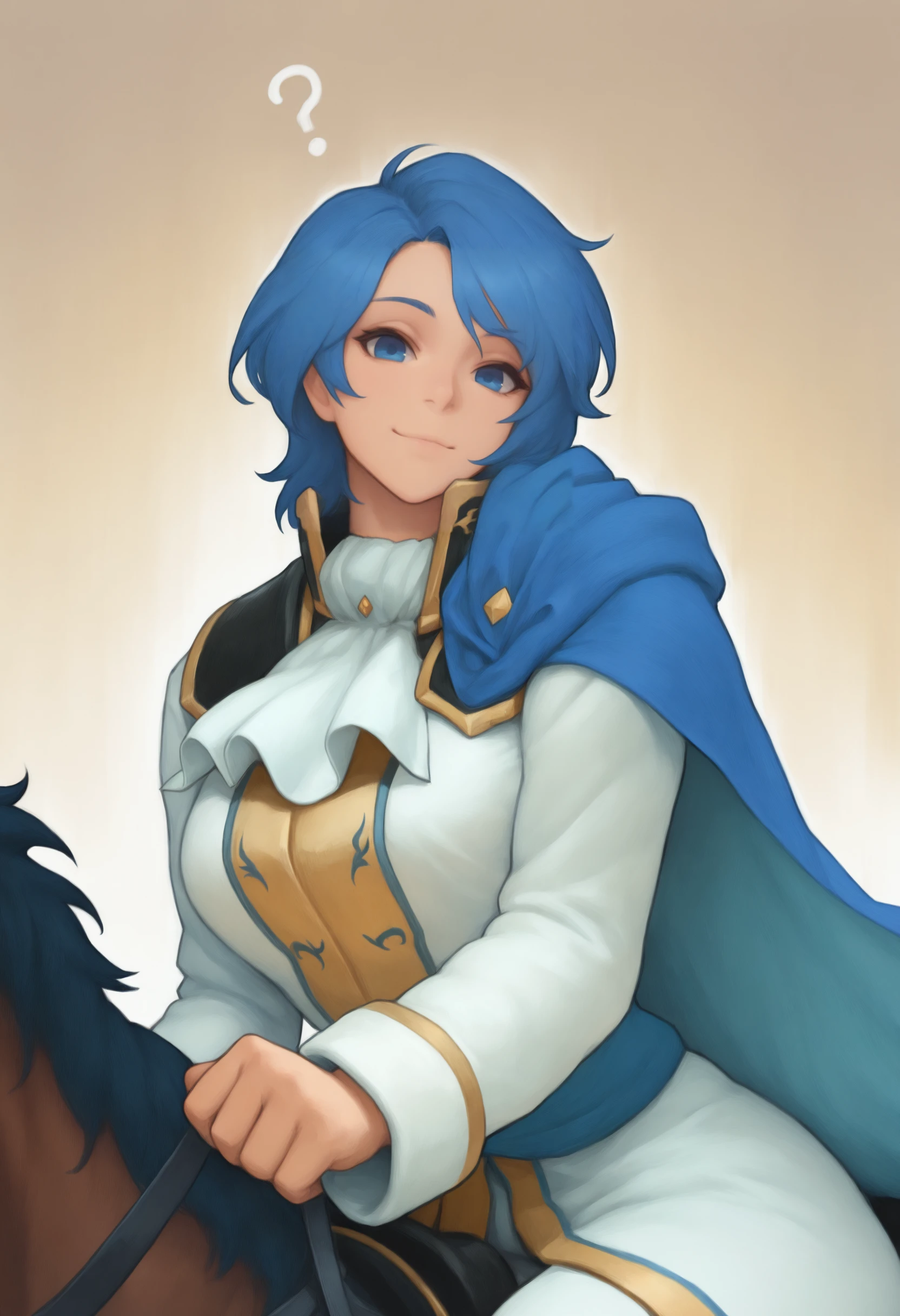 Tags are "blue hair, blue eyes, short hair, white coat, white pants, ascot, collar, armor, blue cape, long sleeves"