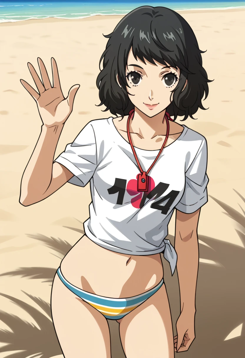 p5kawakami-swim, t-shirt, tied shirt, whistle, bikini bottom only, striped bikini,