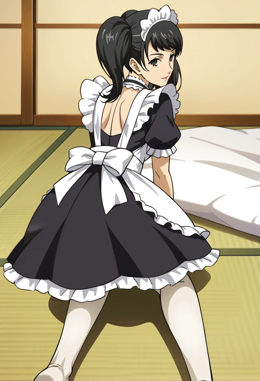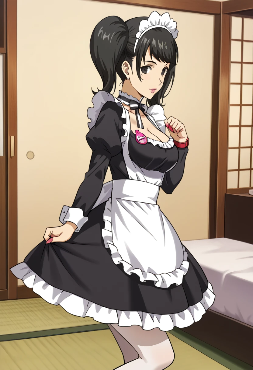 p5kawakami-becky, maid, twintails, pantyhose, white pantyhose, maid headdress, apron, cleavage, pink button badge, wristwatch, red watch strap, mary janes,