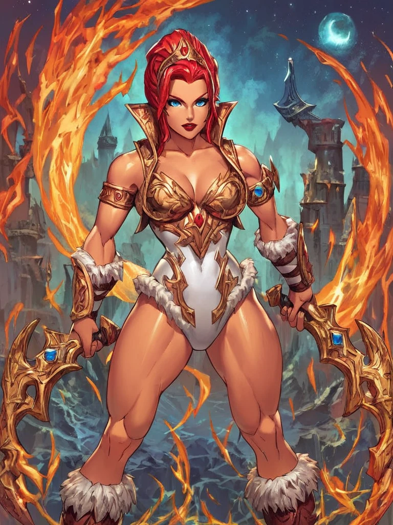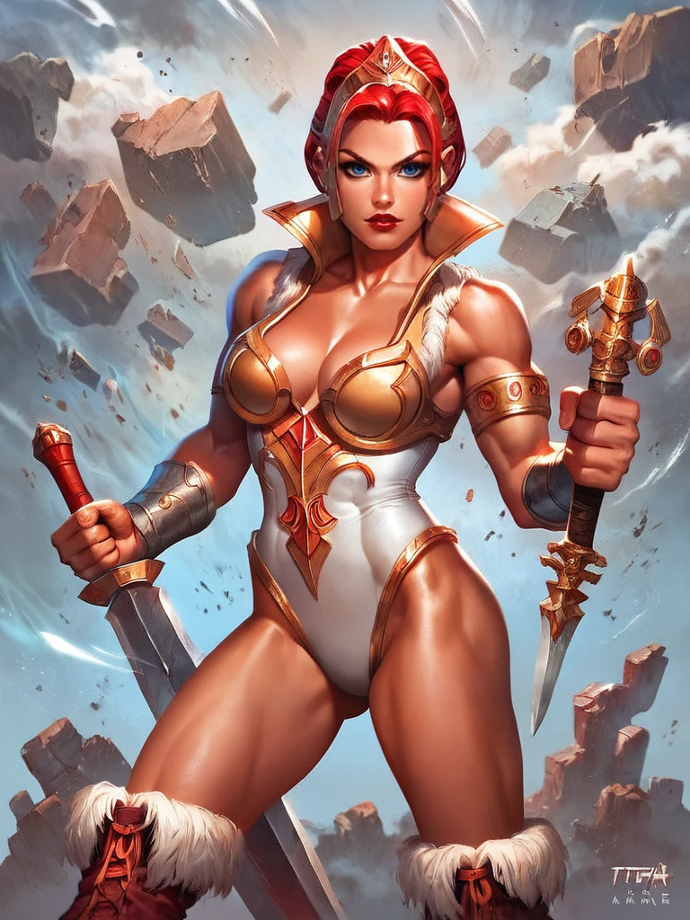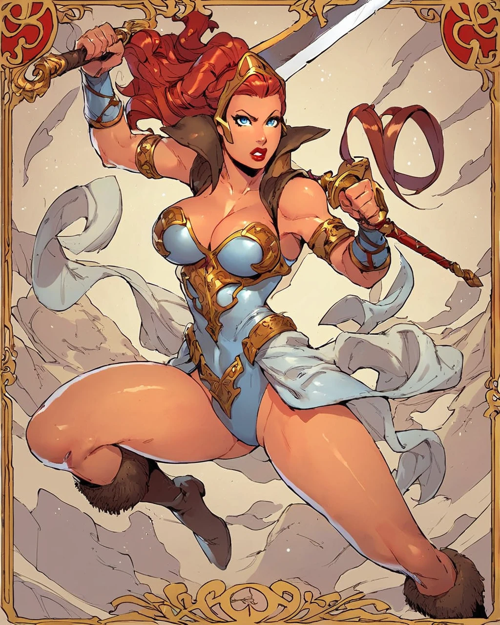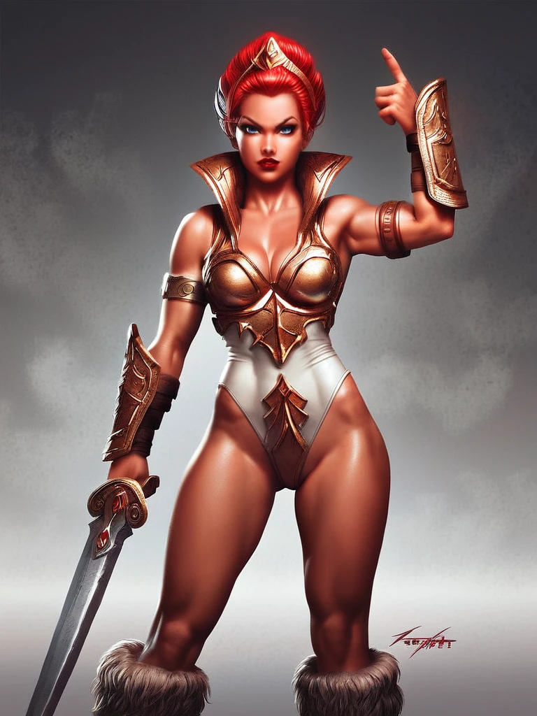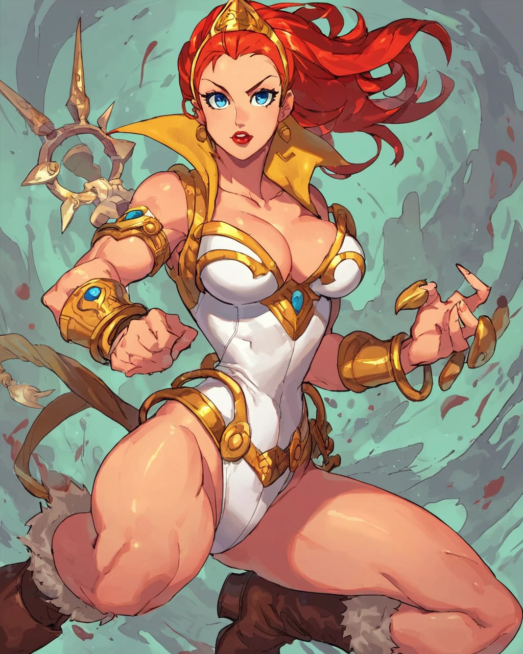 ,score_9, score_8_up, score_7_up, <lora:TeelaQuiron_character:0.57> teelaquiron, teelahemanquiron, 1girl, solo, red hair, weapon, armor, breasts, holding sword, cleavage, lipstick, makeup, boots, shield, brown hair, leotard, armlet, looking at viewer, red lips, fight pose, blue eyes,