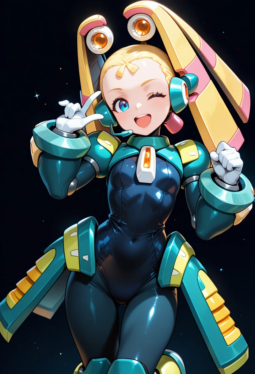 pallette, blonde hair, twintails, blue eyes, robot ears, bodysuit, gloves, white gloves, boots
