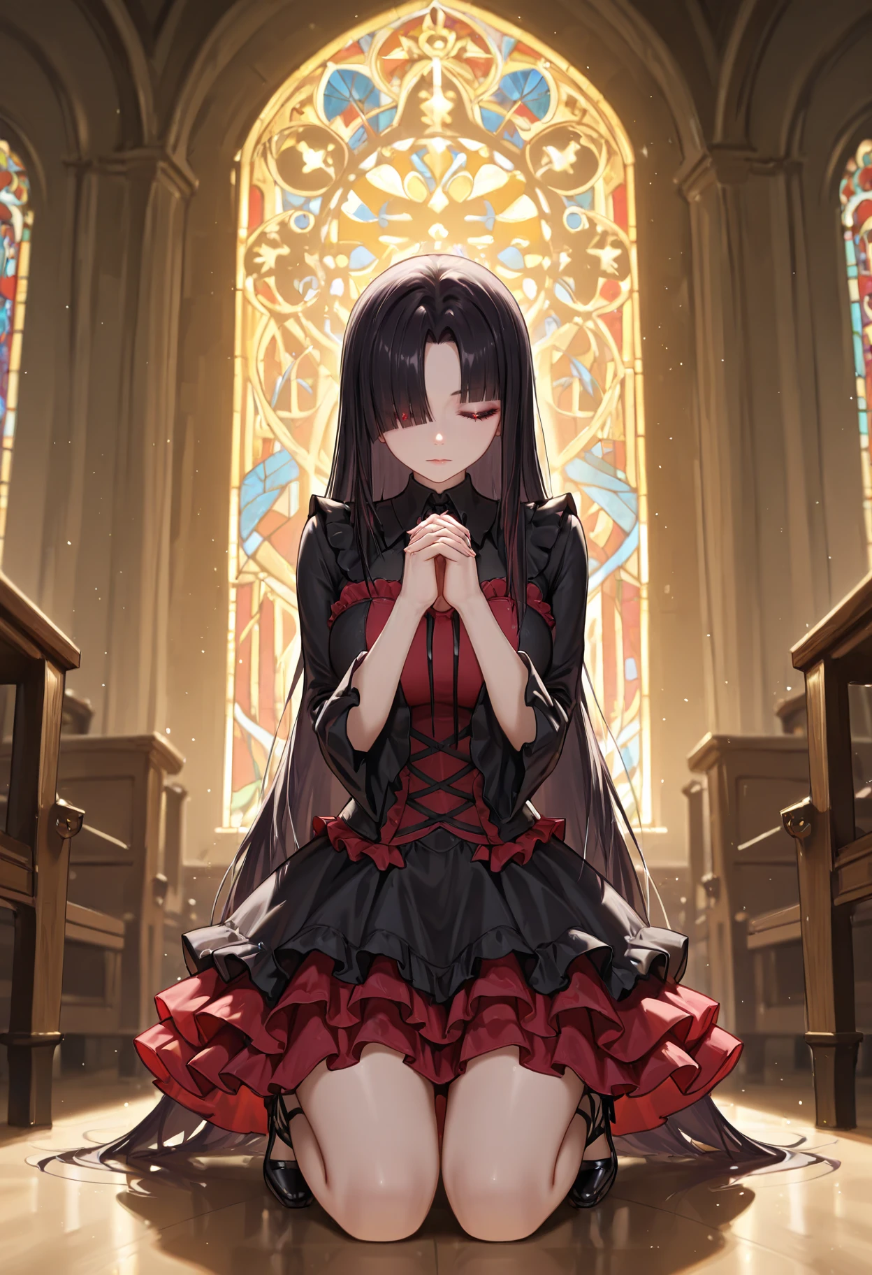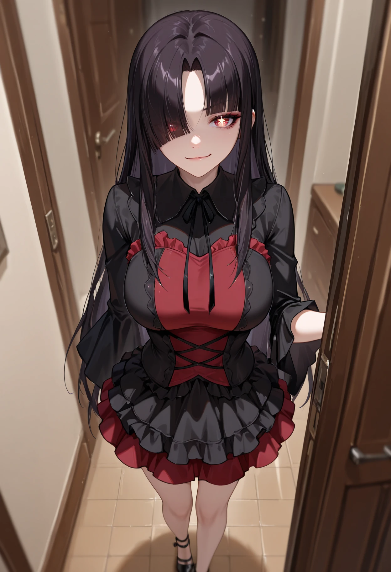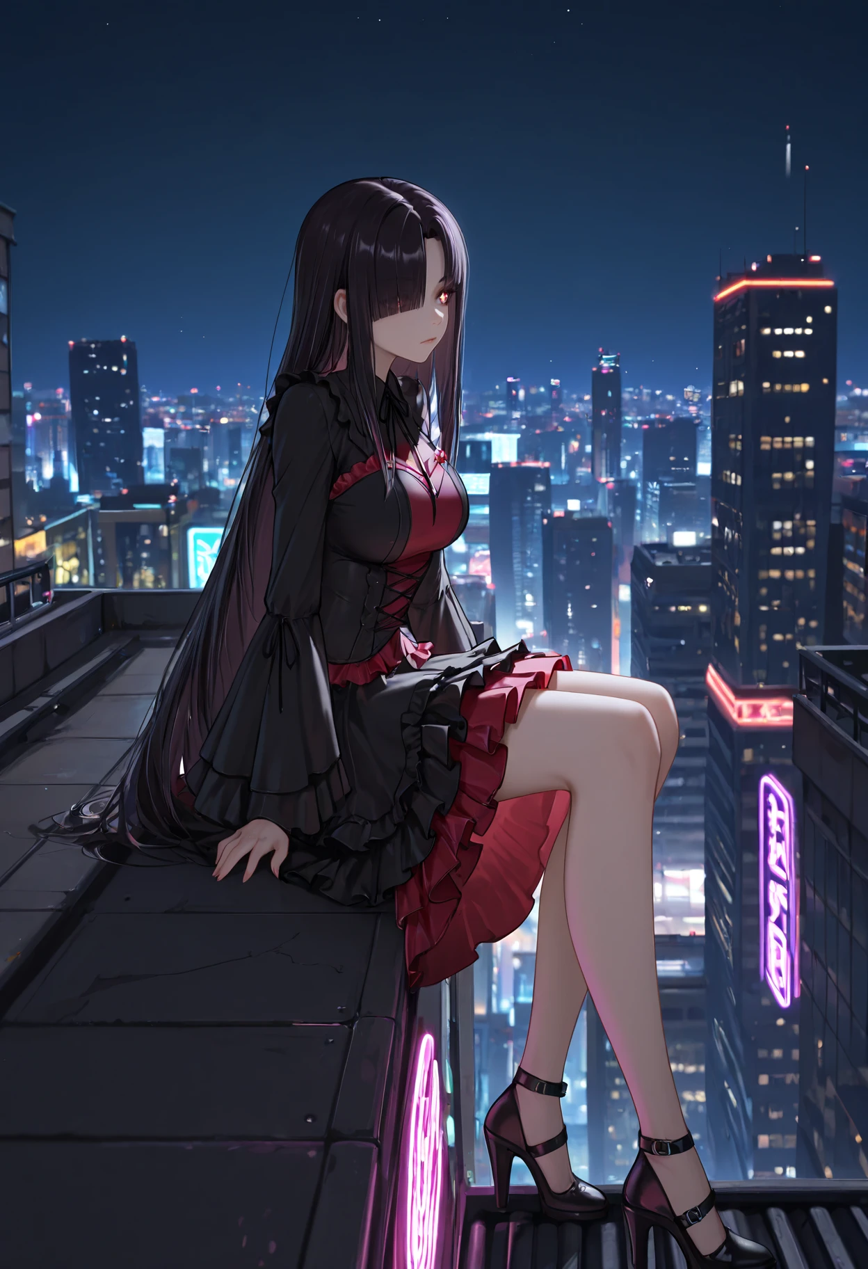 black dress, red dress, two-tone dress, layered dress, frills, high collared dress, long sleeves, wide sleeves, black high heels, center cross lace, black neck ribbon,
