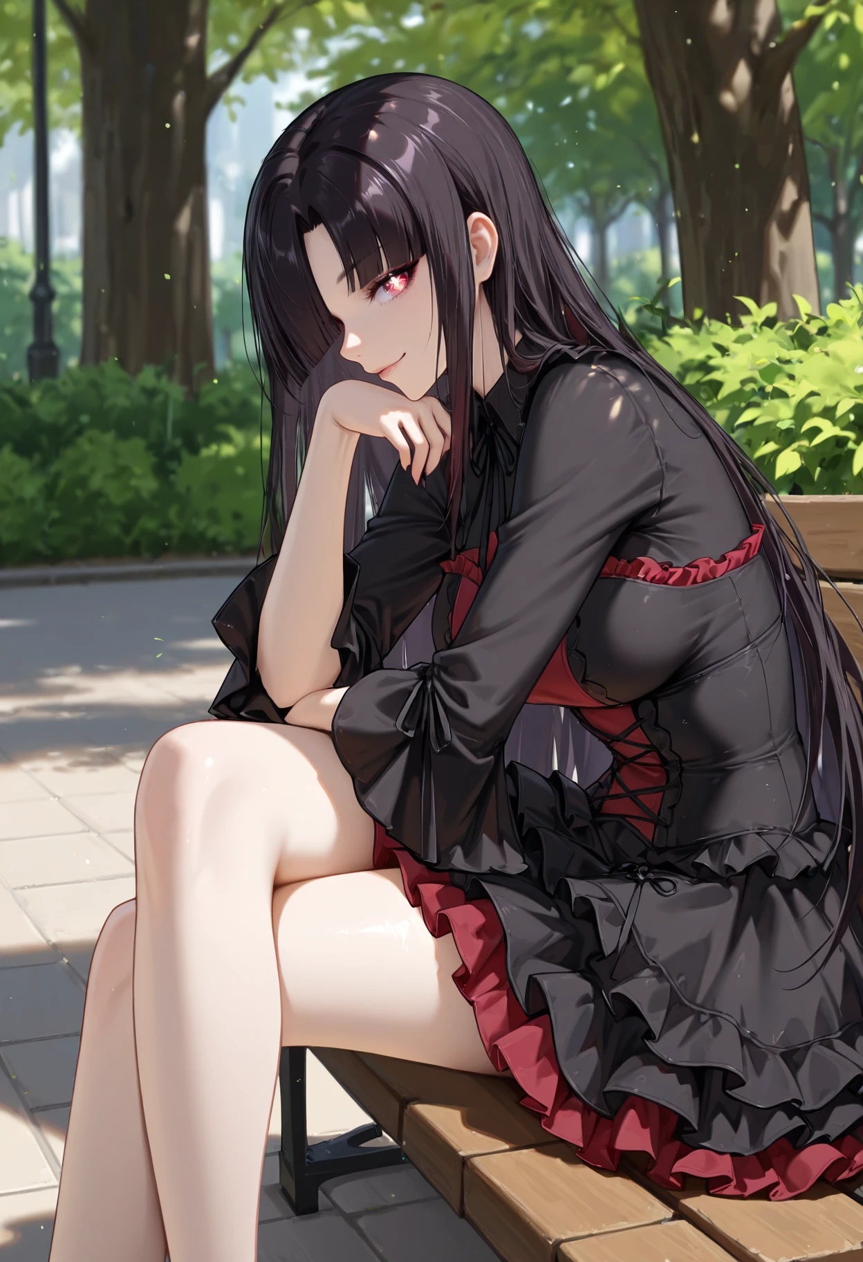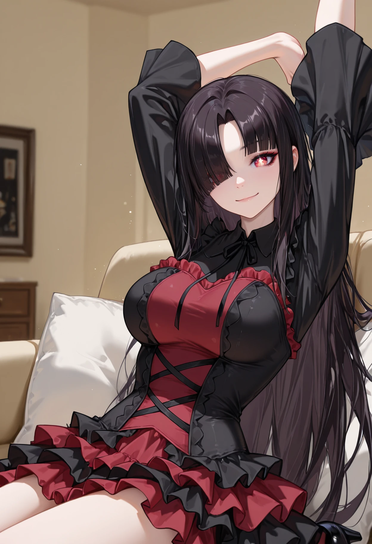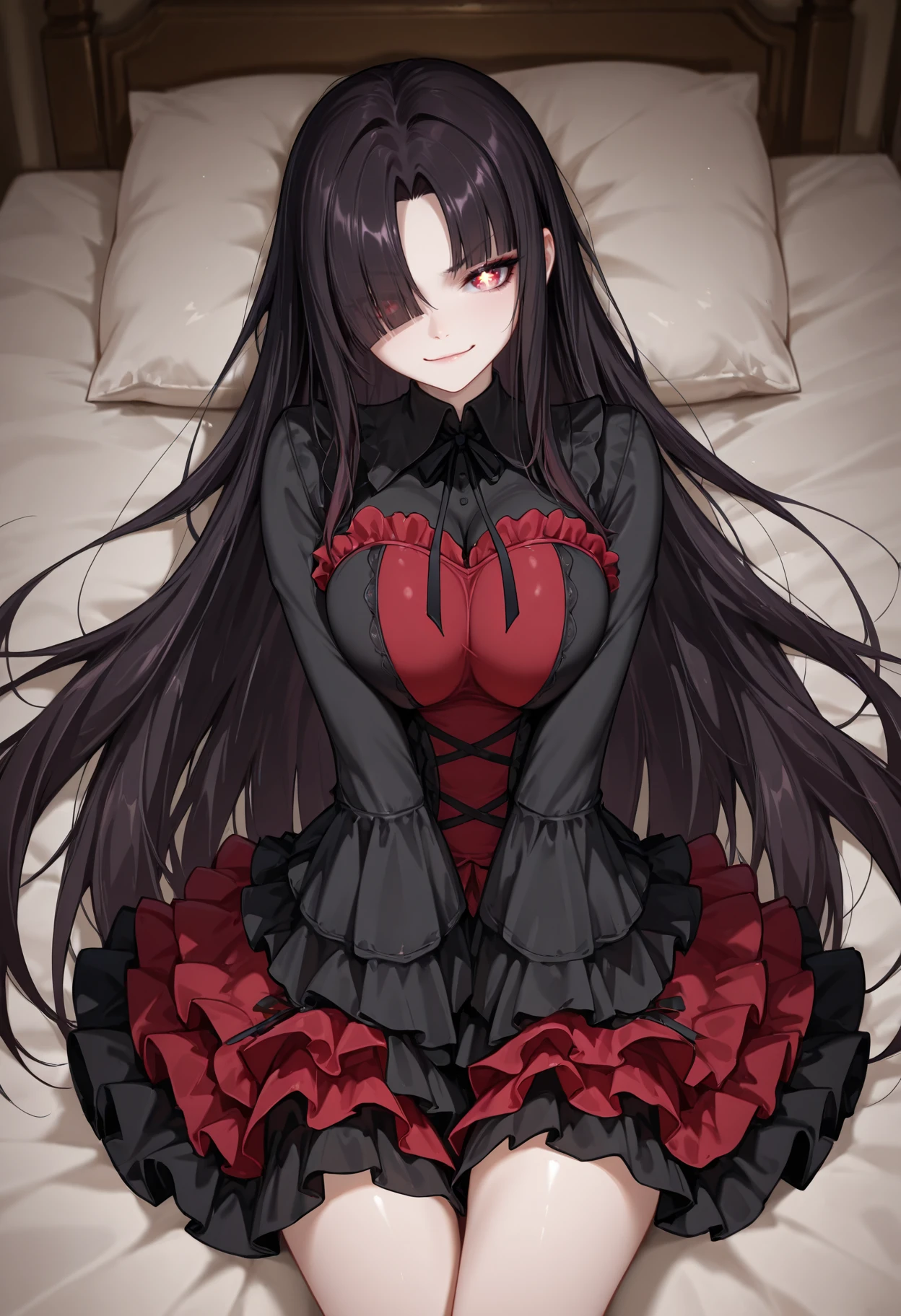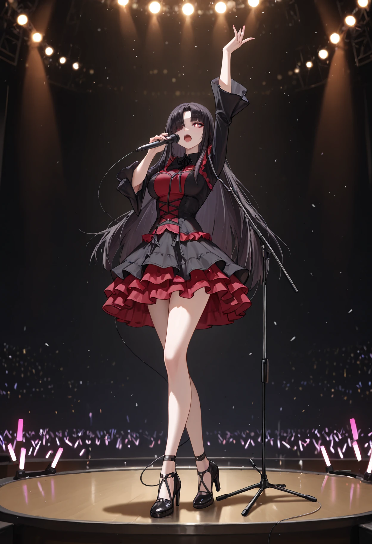 black dress, red dress, two-tone dress, layered dress, frills, high collared dress, long sleeves, wide sleeves, black high heels, center cross lace, black neck ribbon,