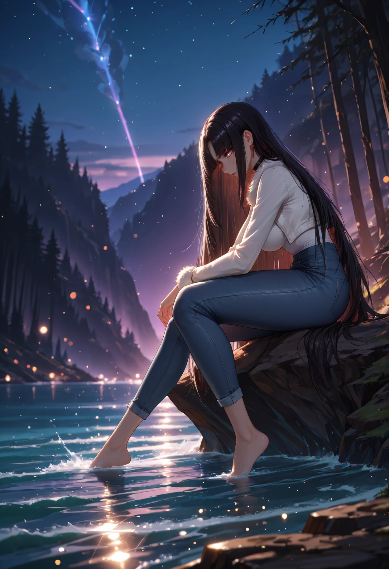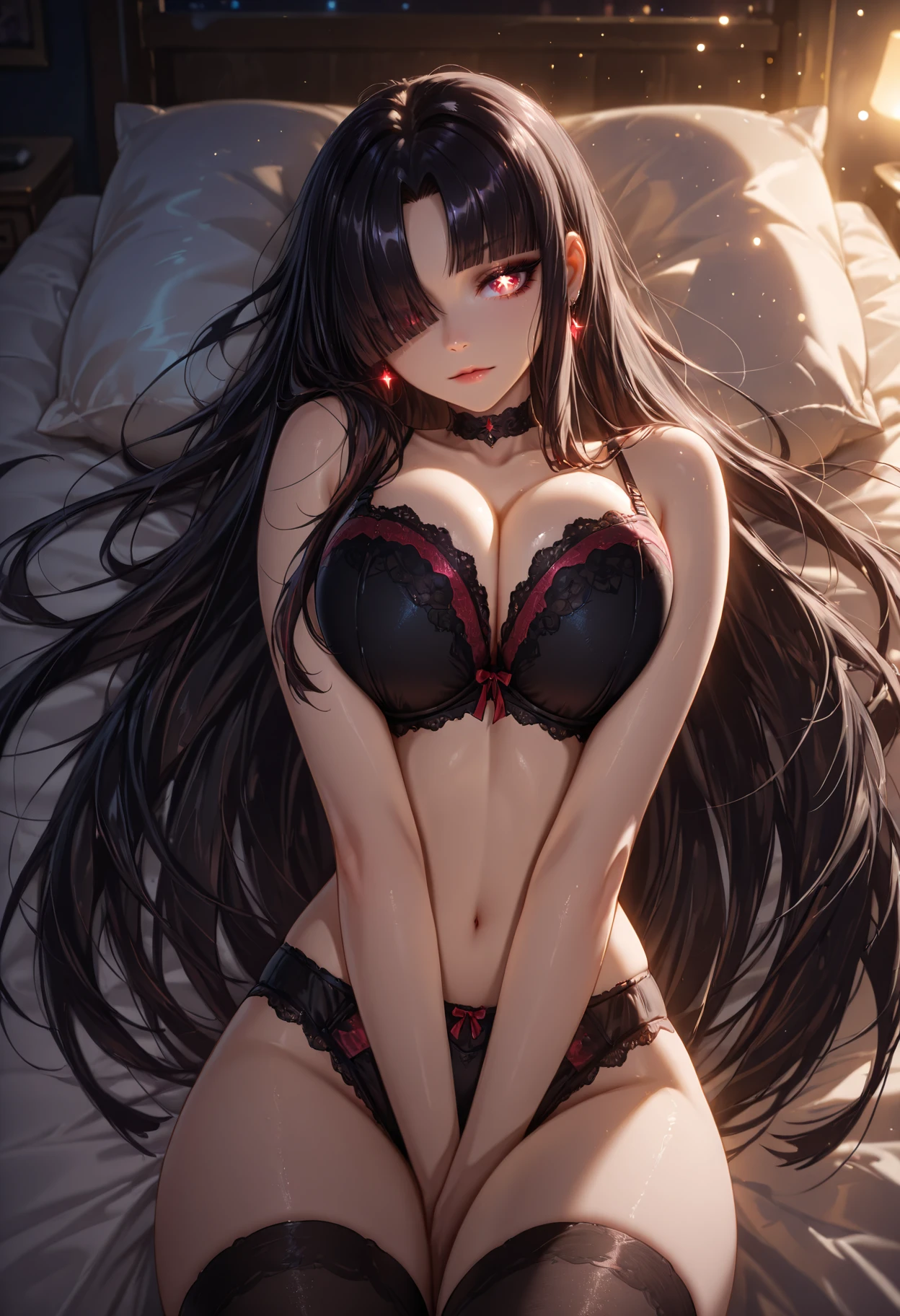 xuelixl, red eyes, star-shaped pupils, black hair, very long hair, hair over one eye, parted bangs, blunt bangs, asymmetrical bangs, straight hair
