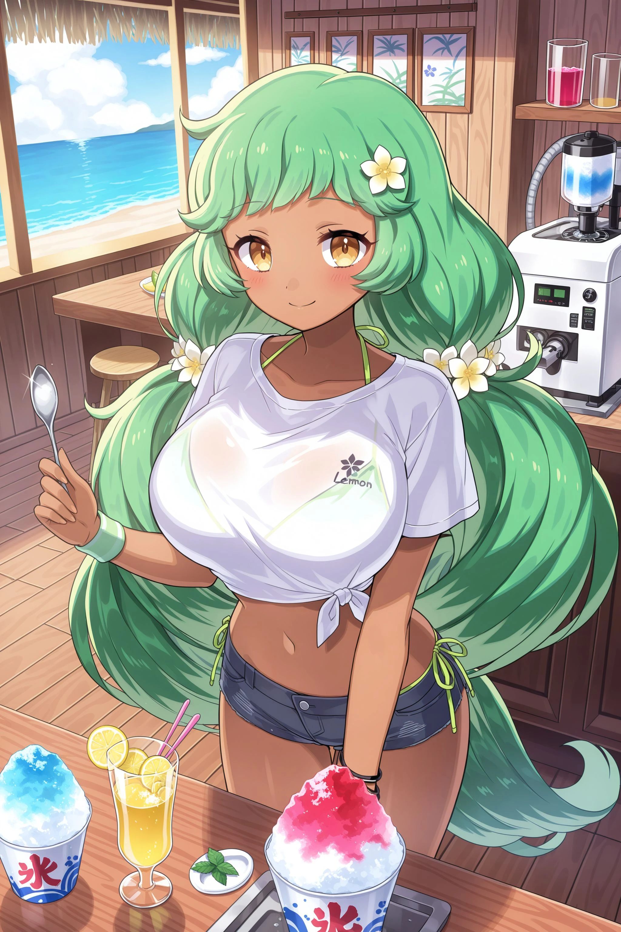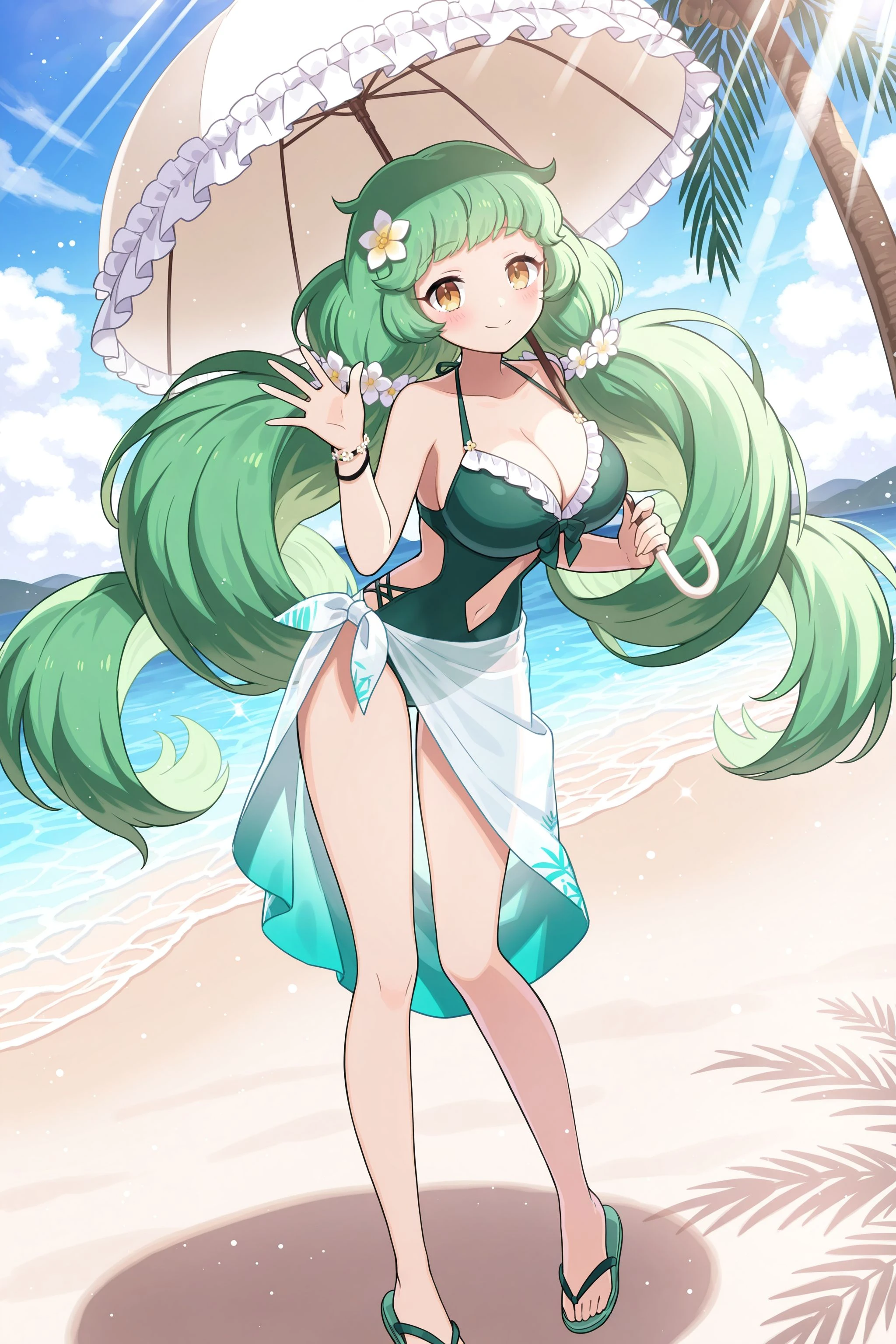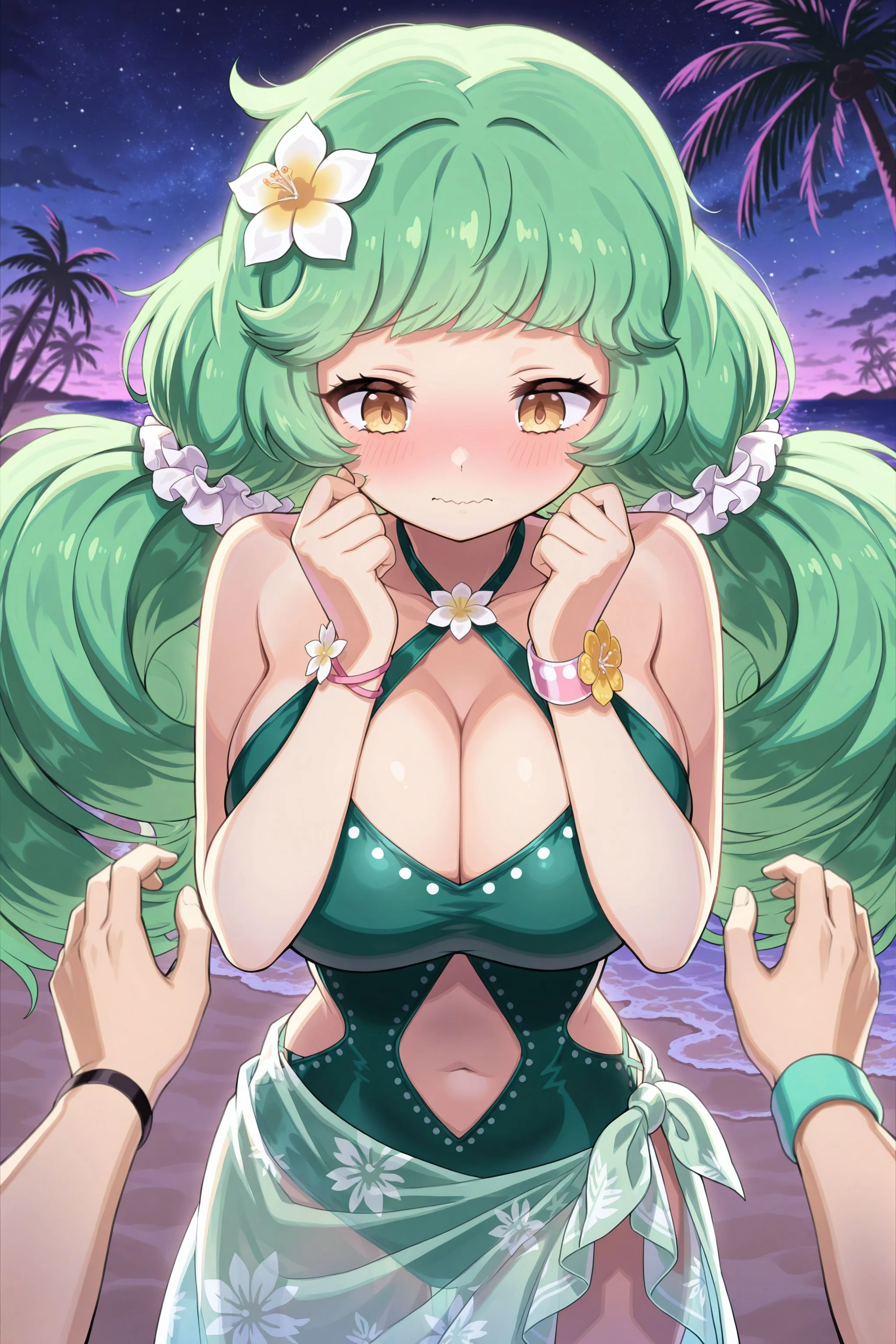 bikini-a: hair flower, hair ornament, green bikini, frilled bikini, bow, cleavage, jewelry, navel, beads, bead_bracelet, bead_necklace