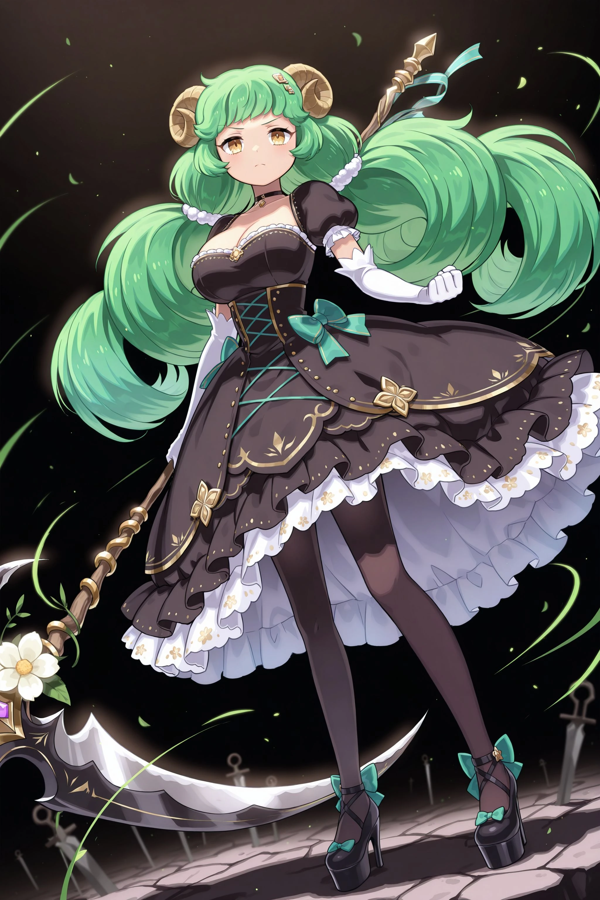 def: hair ornament, choker, black dress, flower, cleavage, puffy short sleeves, elbow gloves, white gloves, bow, frills, pantyhose, platform footwear, high heels