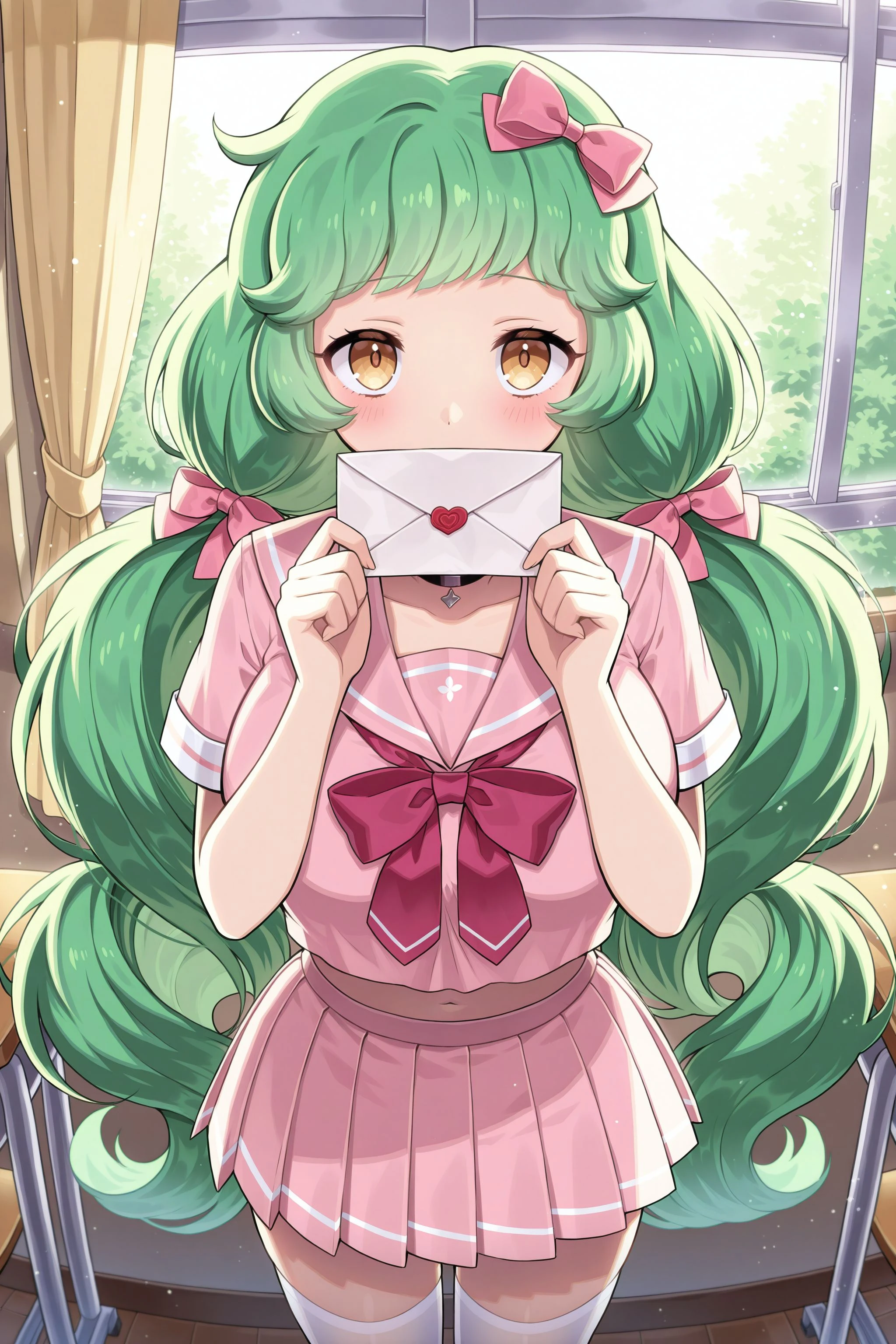 nurse: nurse, nurse cap, green dress, heart, frills, white apron, puffy_short_sleeves, frilled_dress, white_pantyhose