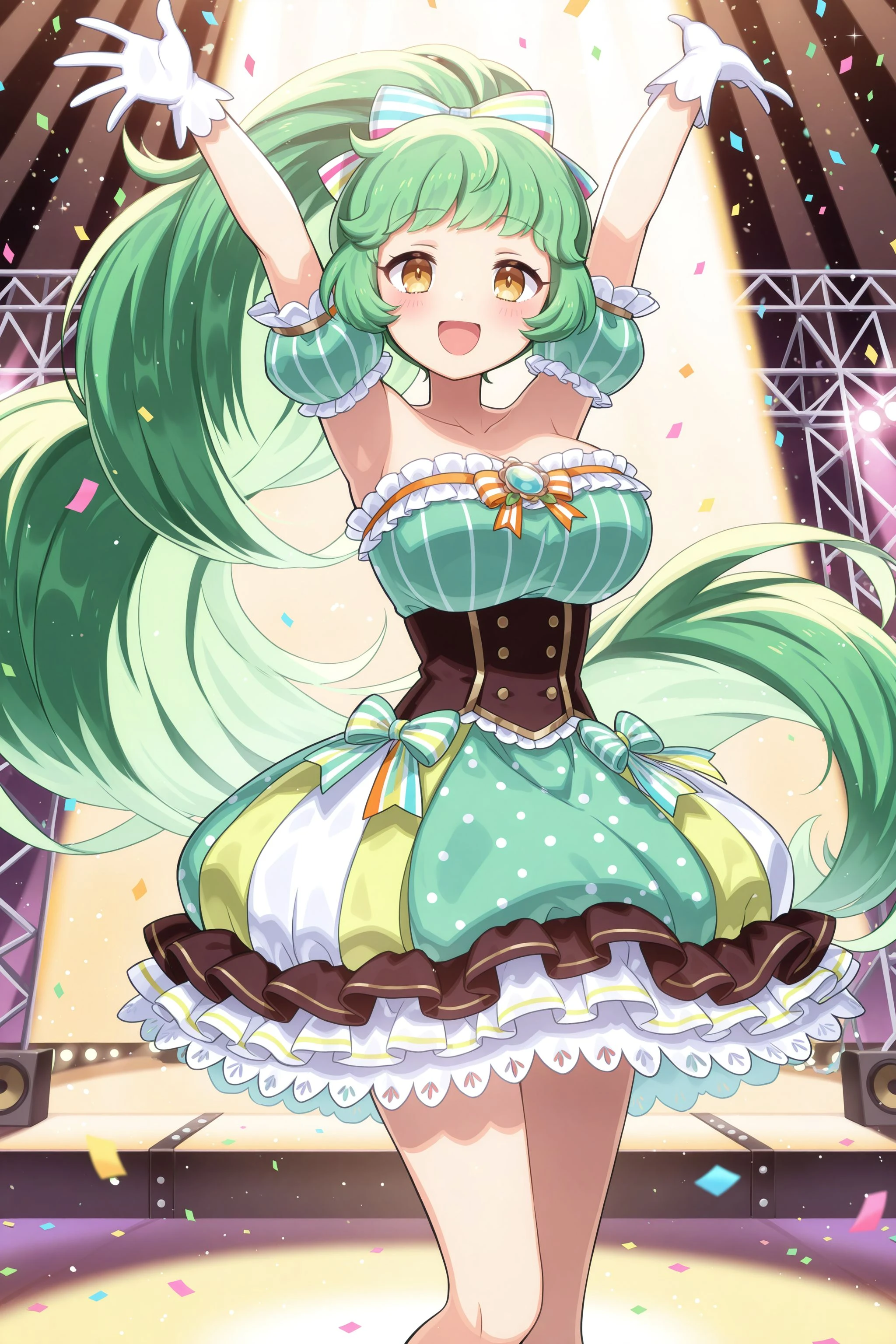 idol2: hair bow, green dress, bow, striped bow, bare shoulders, collarbone, puffy short sleeves, frills, white gloves, frilled dress, polka dot, puffy skirt, multicolored skirt