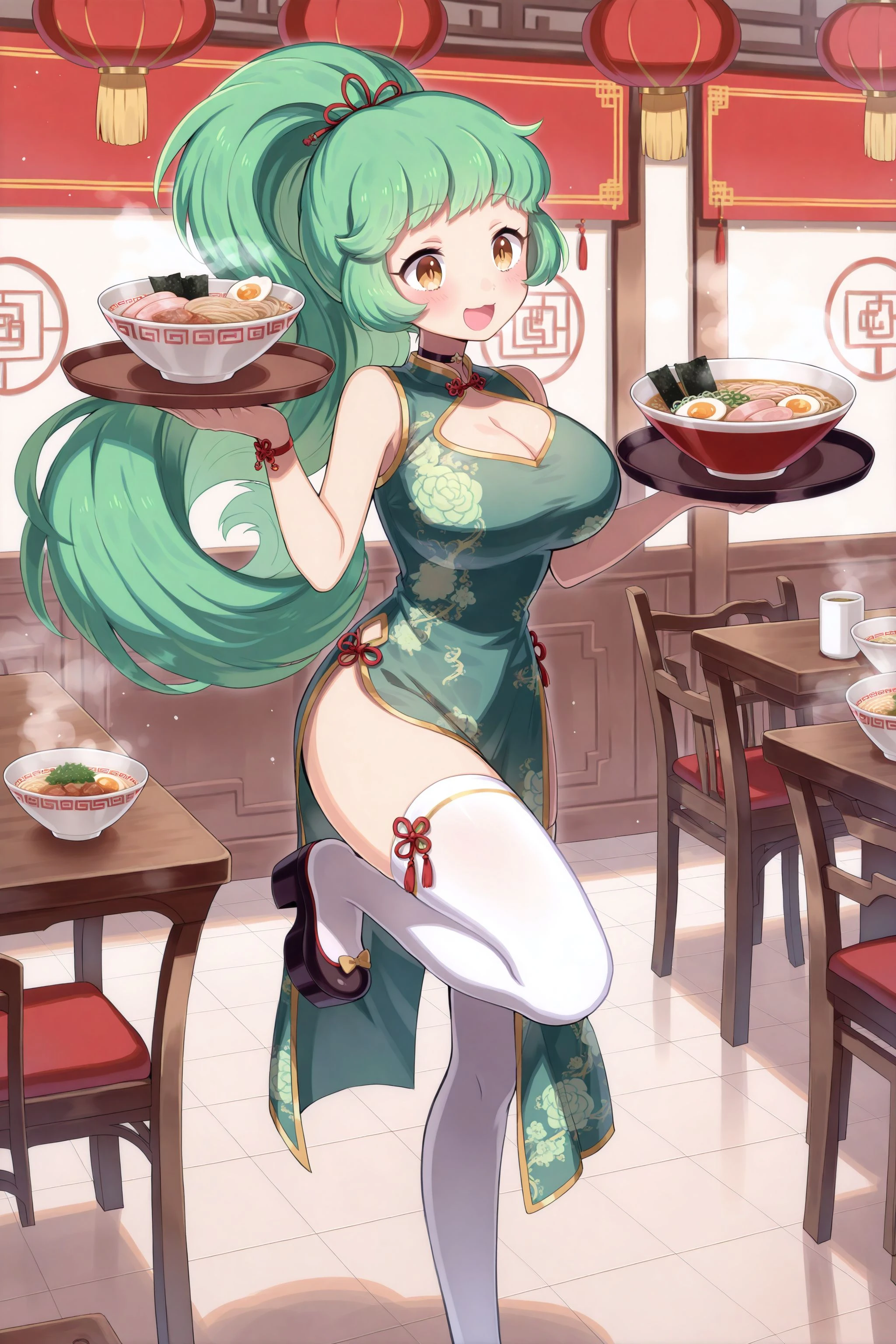 china: hair_ornament, hair_flower, red flower, china dress, green dress, short sleeves, cleavage cutout, heart cutout, purple bow, bracelet, shoulder bag, stuffed panda, green thighhighs