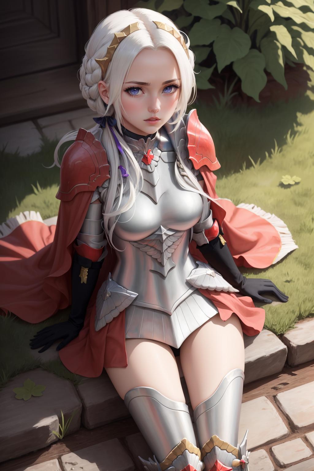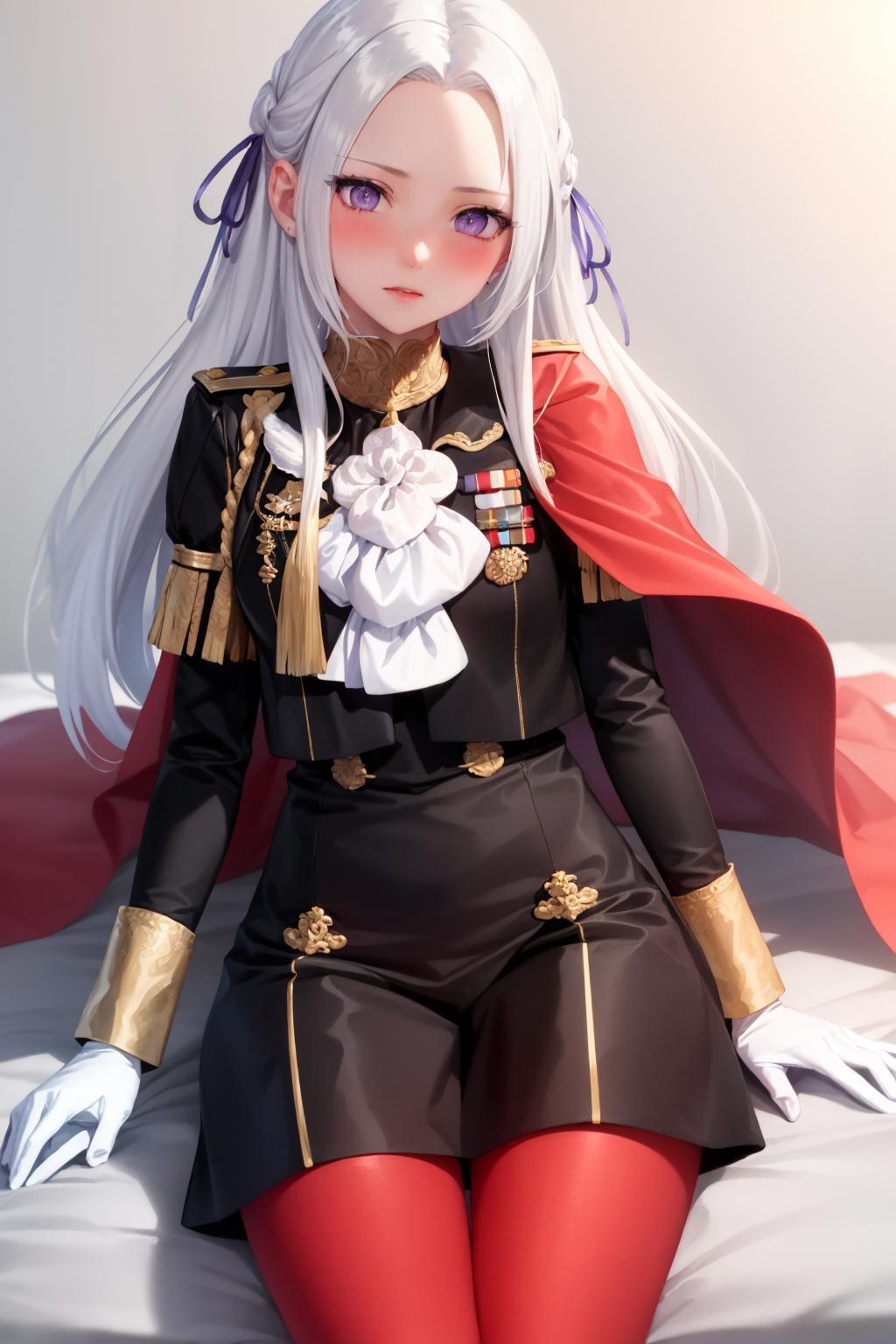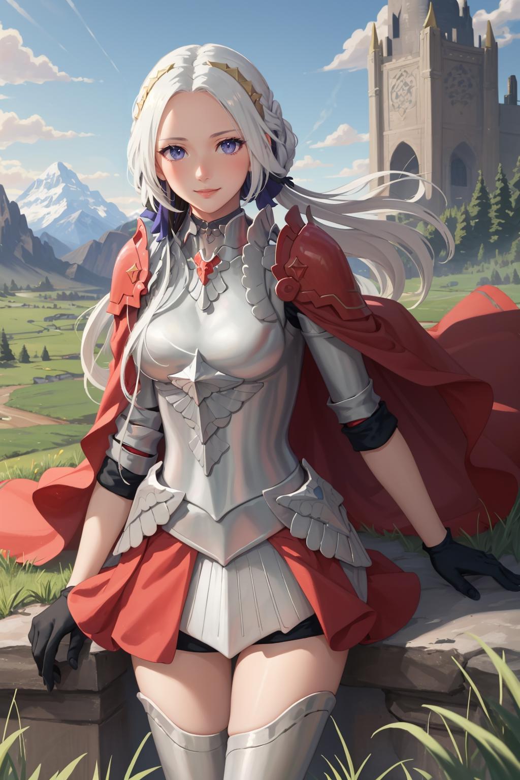 Add "edelgard_hopes, hair ribbon, hair ornament, armor, red cape, armored skirt, black gloves, armored legwear" for her Three Hopes look.