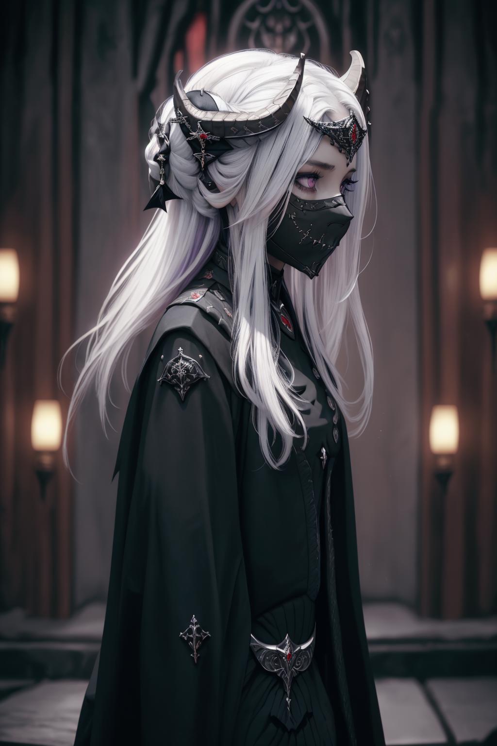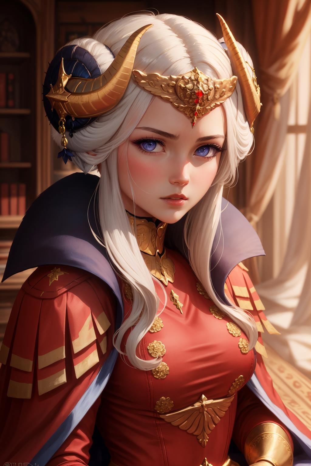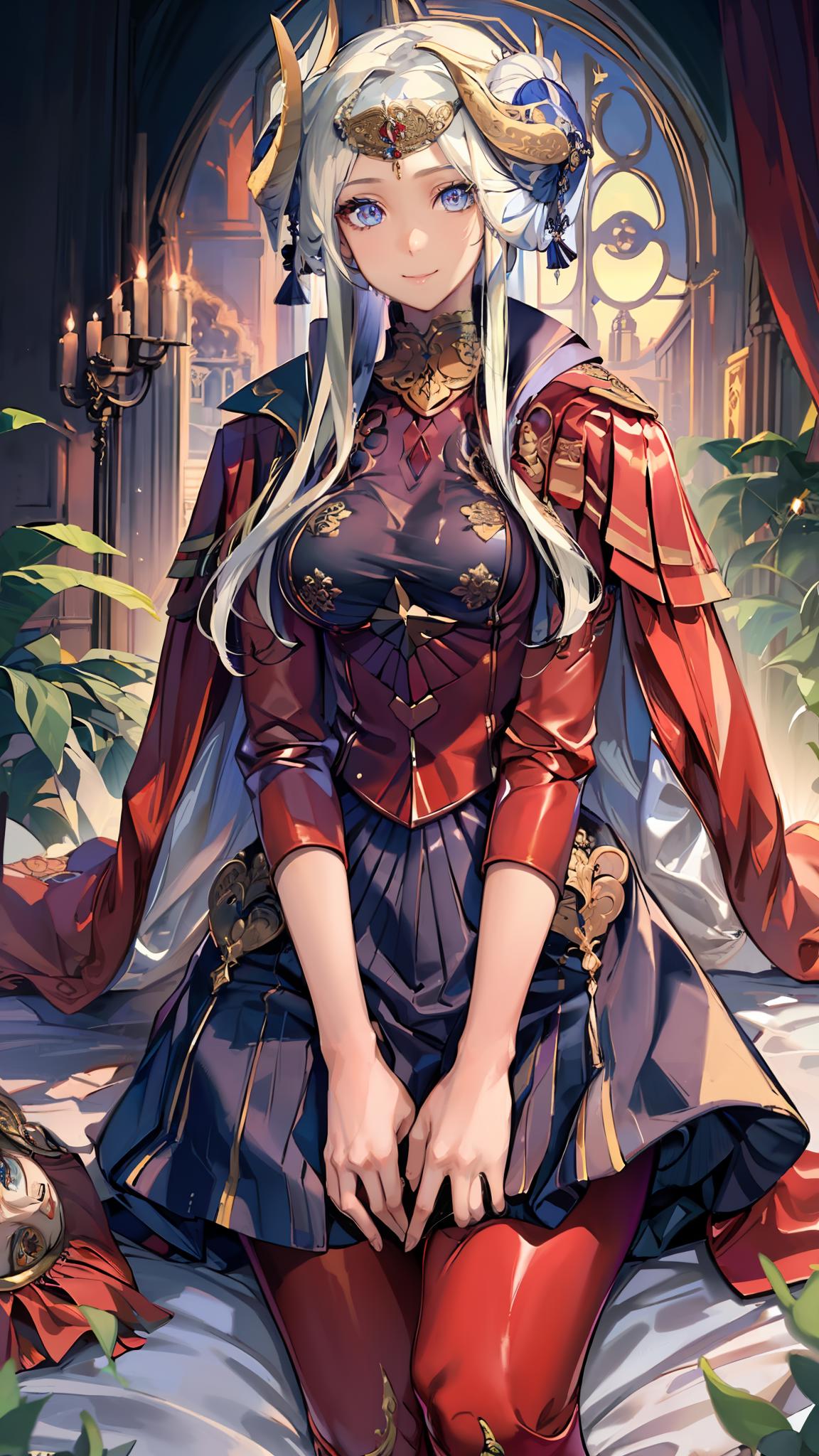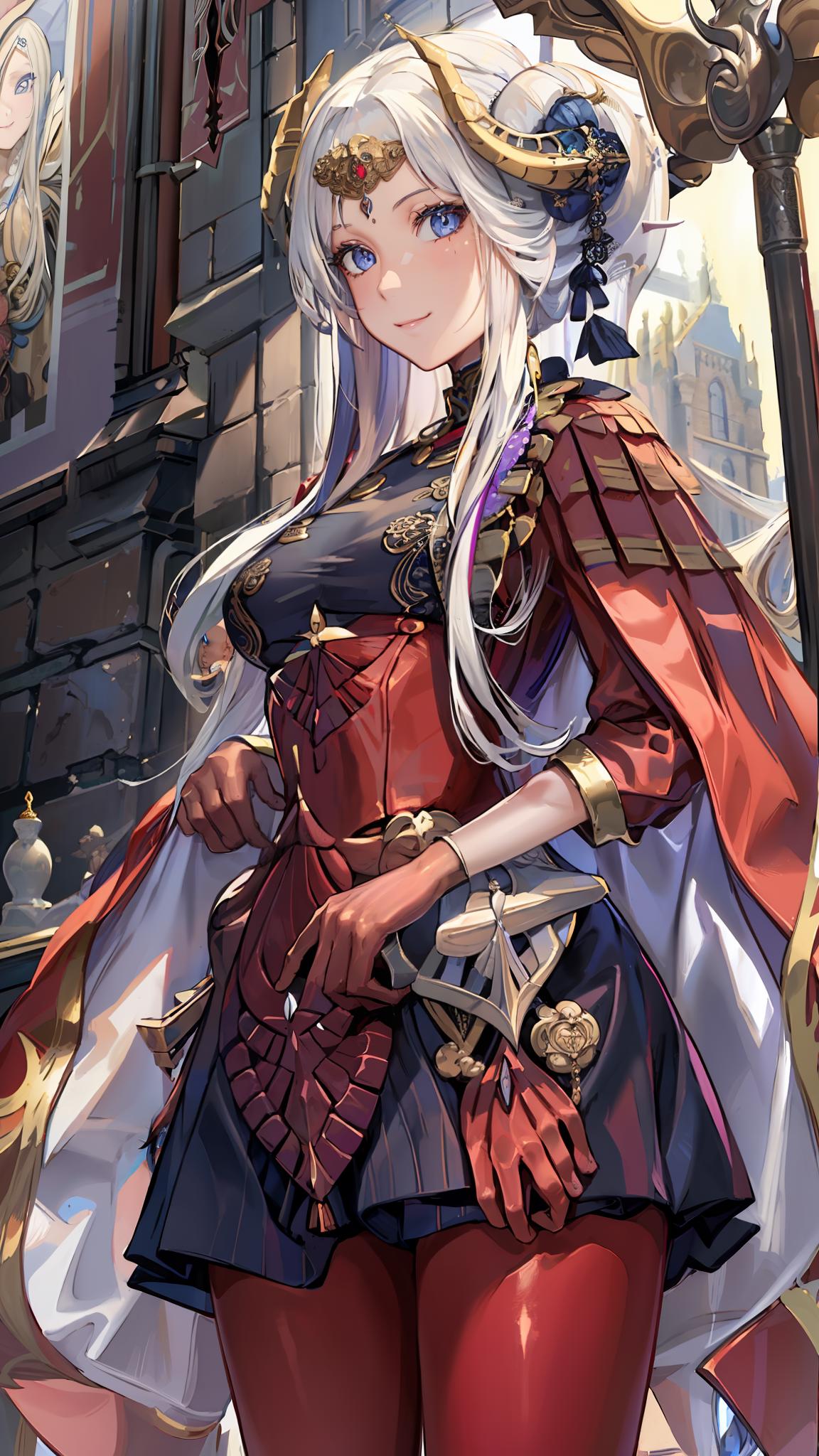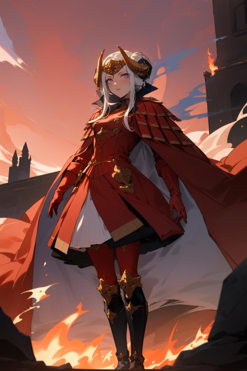 edelgard_timeskip, crown, horns, red dress, red gloves, black boots