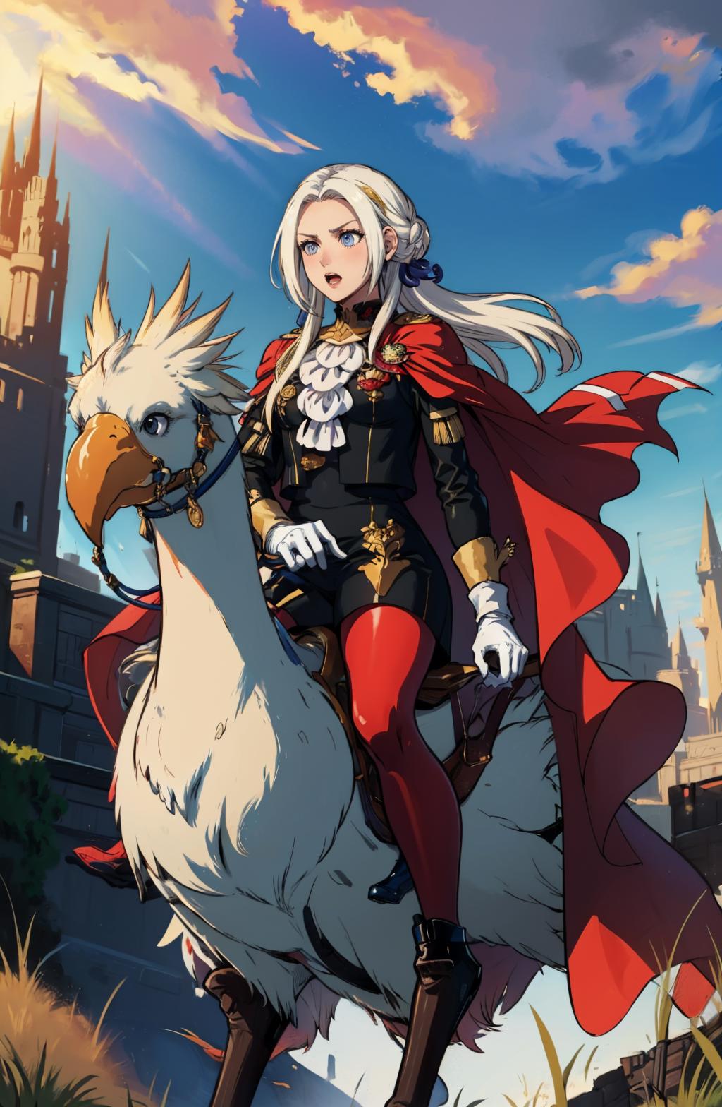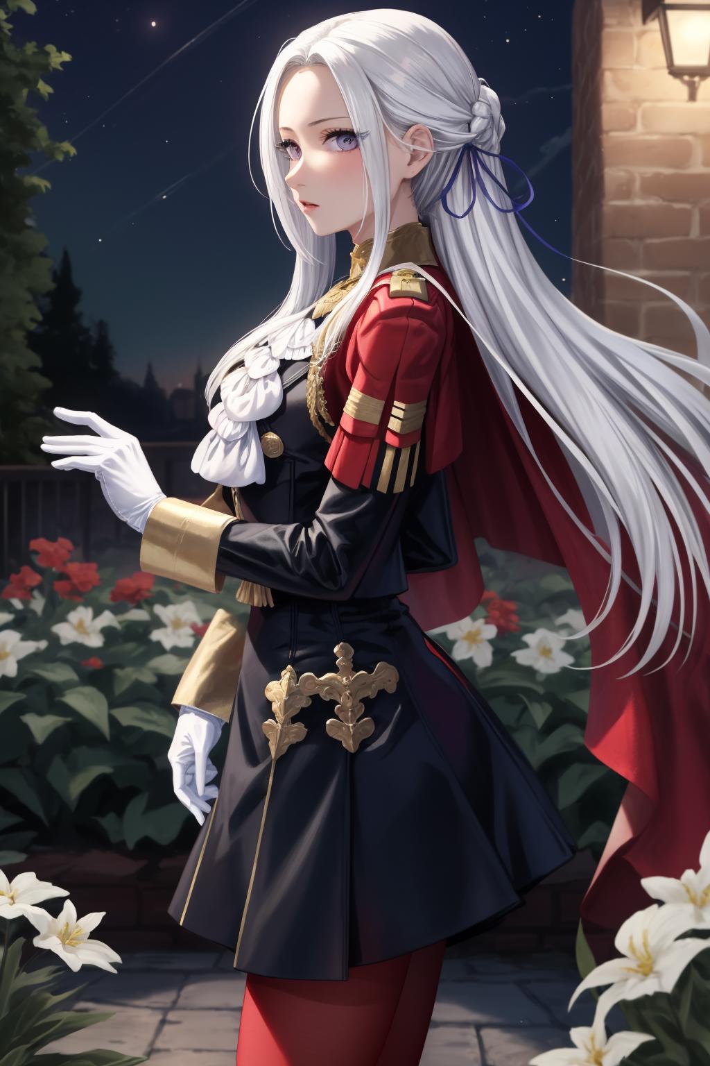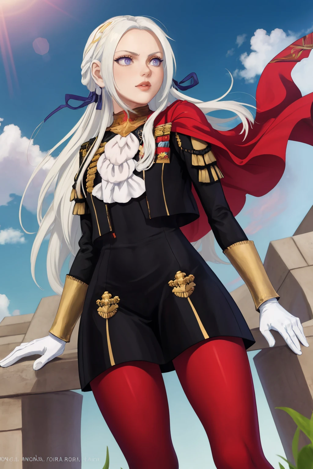 Add "edelgard_academy, hair ribbon, black jacket, black dress, ascot, red cape, red pantyhose, white gloves, high heels" for her academy look.