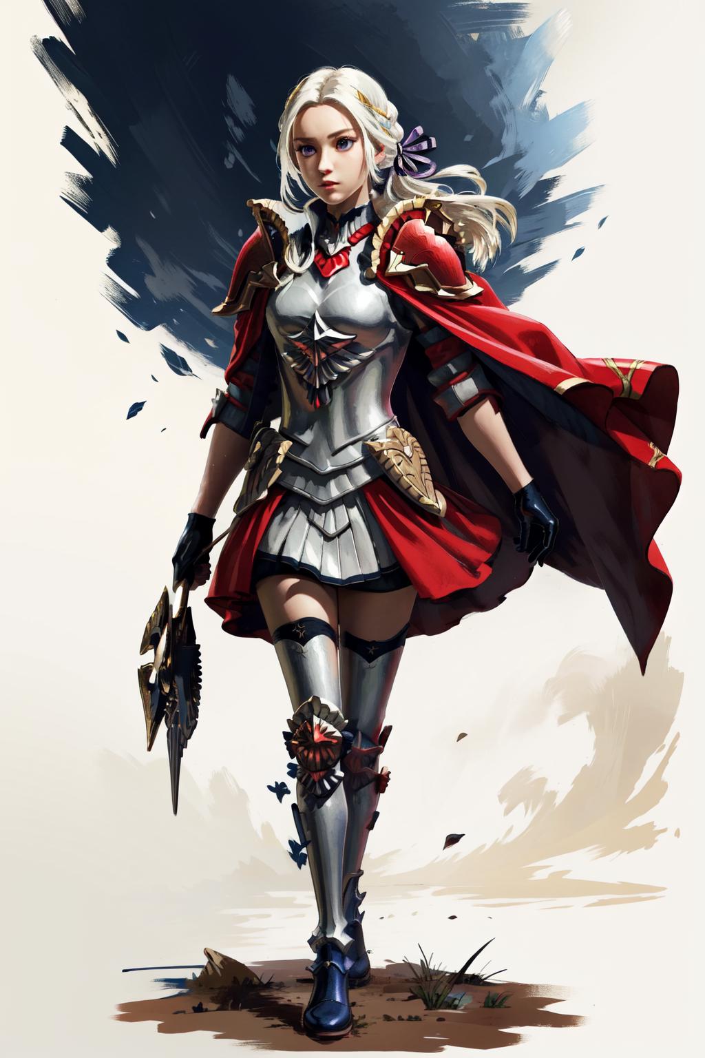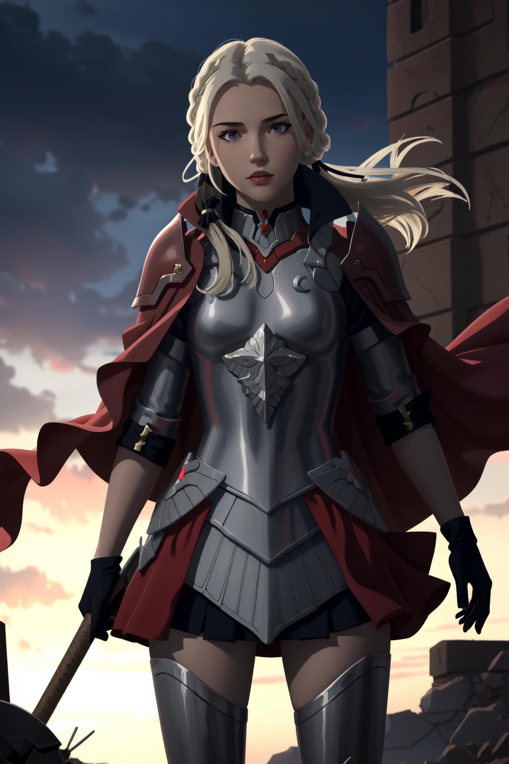edelgard_hopes, hair ribbon, hair ornament, armor, red cape, armored skirt, black gloves, armored legwear