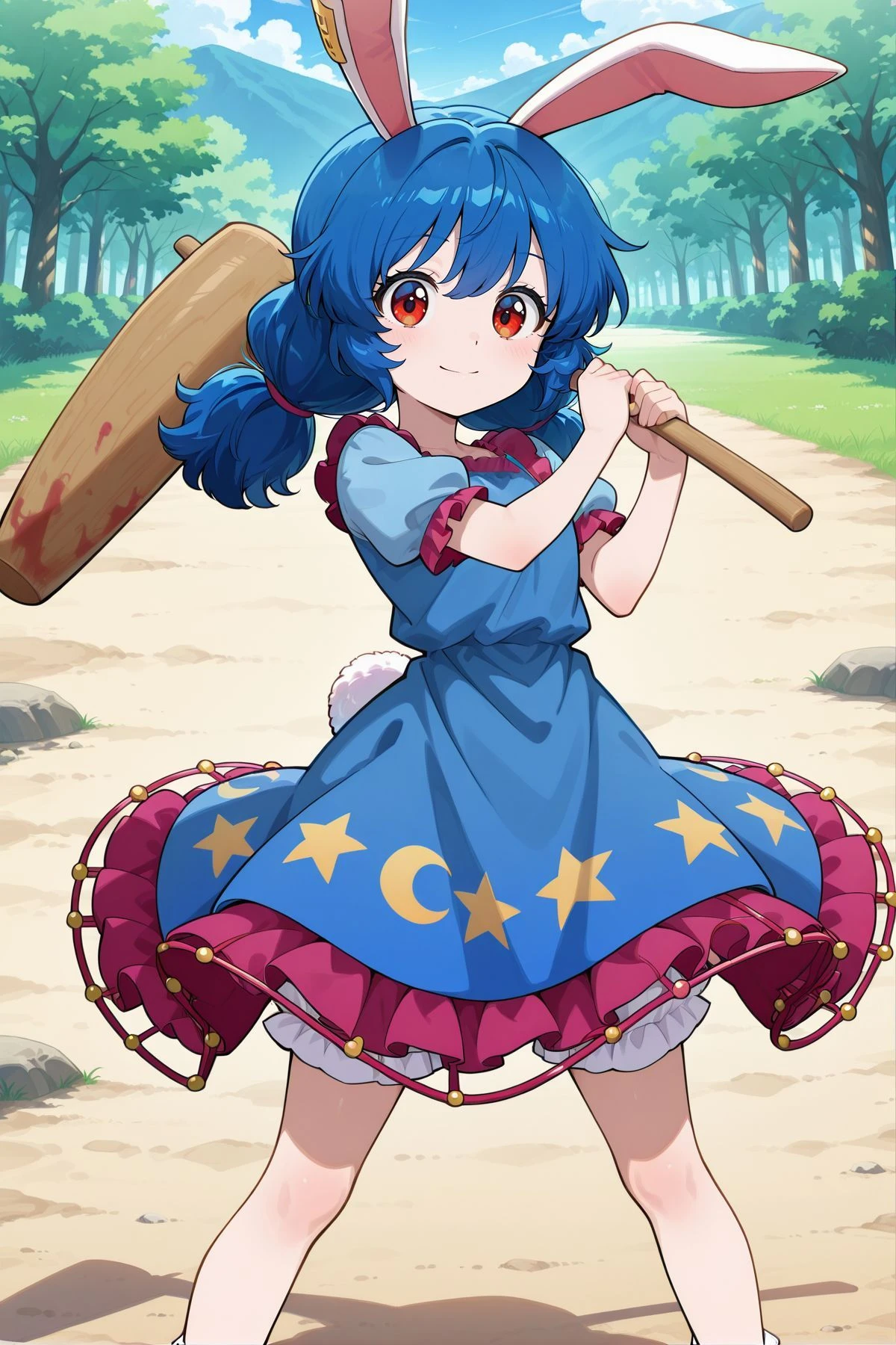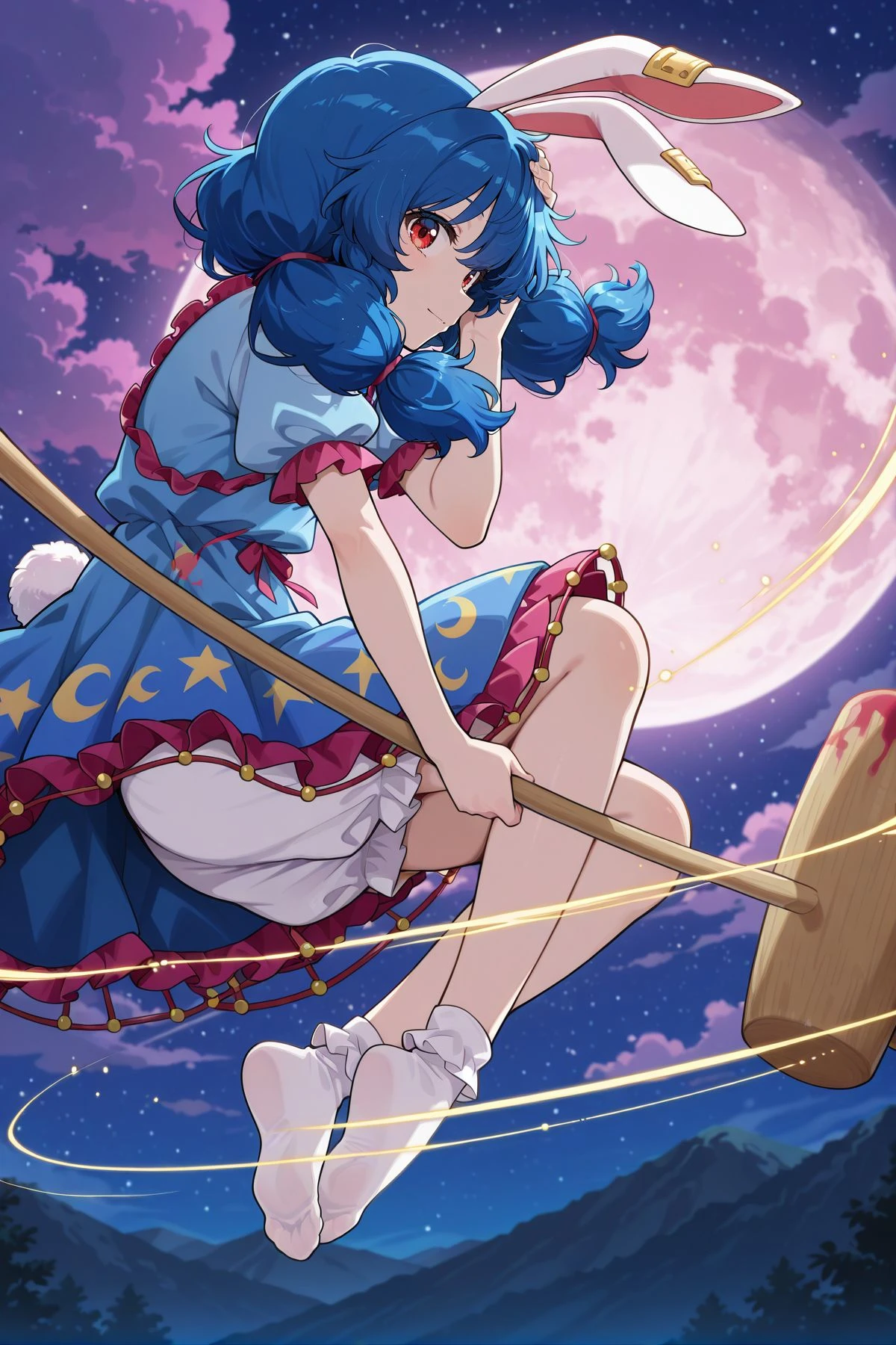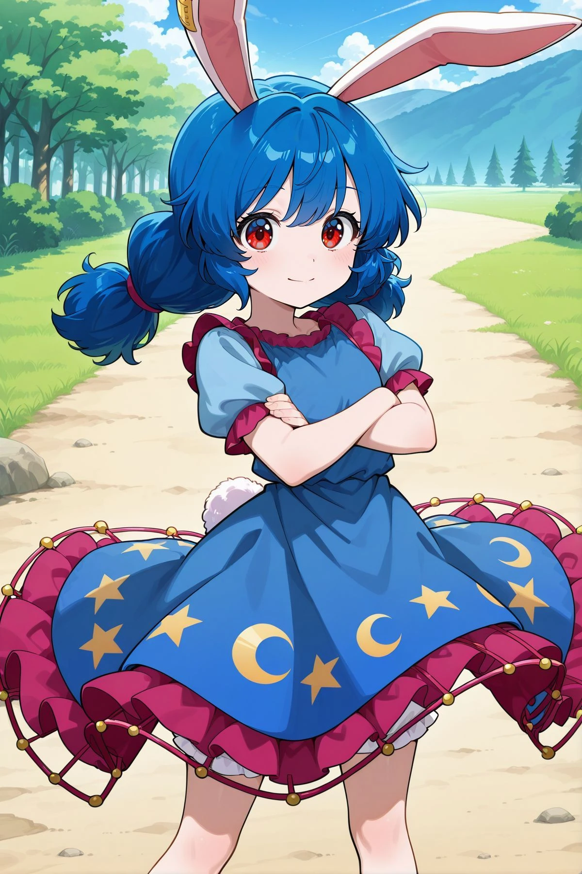 seiran, 1girl, solo, red eyes, blue hair, low twintails, rabbit ears, rabbit tail,yellow earclip, blue dress, puffy short sleeves, frilled sleeves, layered skirt, crescent print skirt, star print skirt, frilled skirt, bloomers, white socks,Optional :