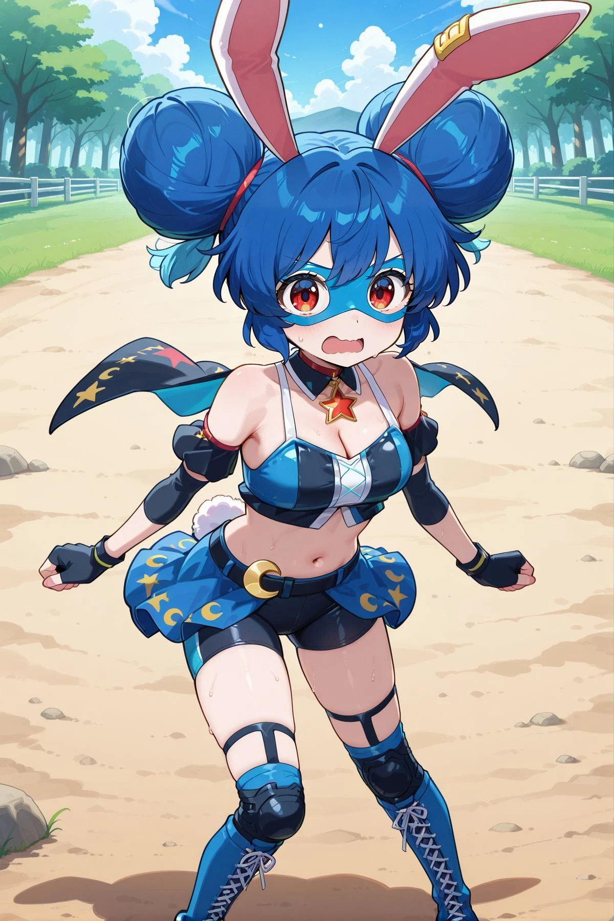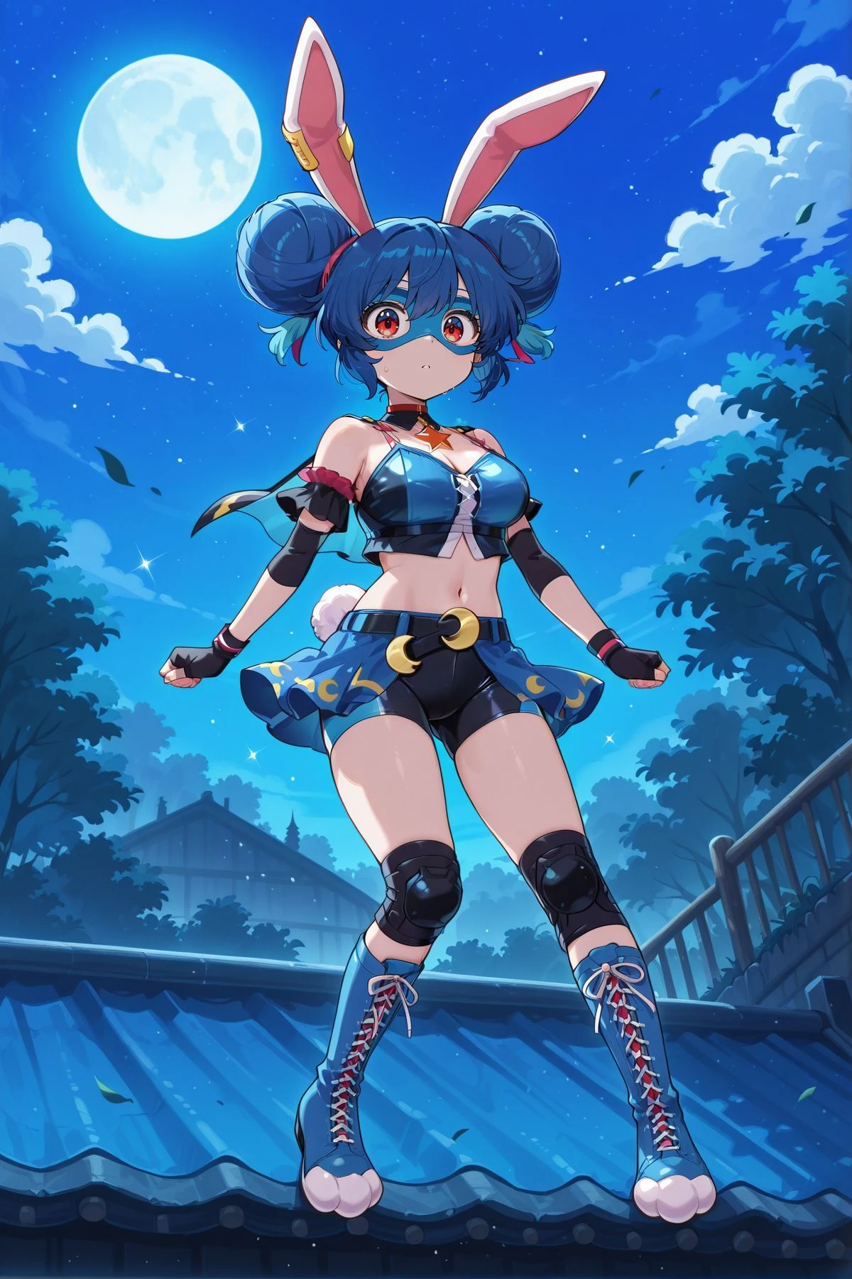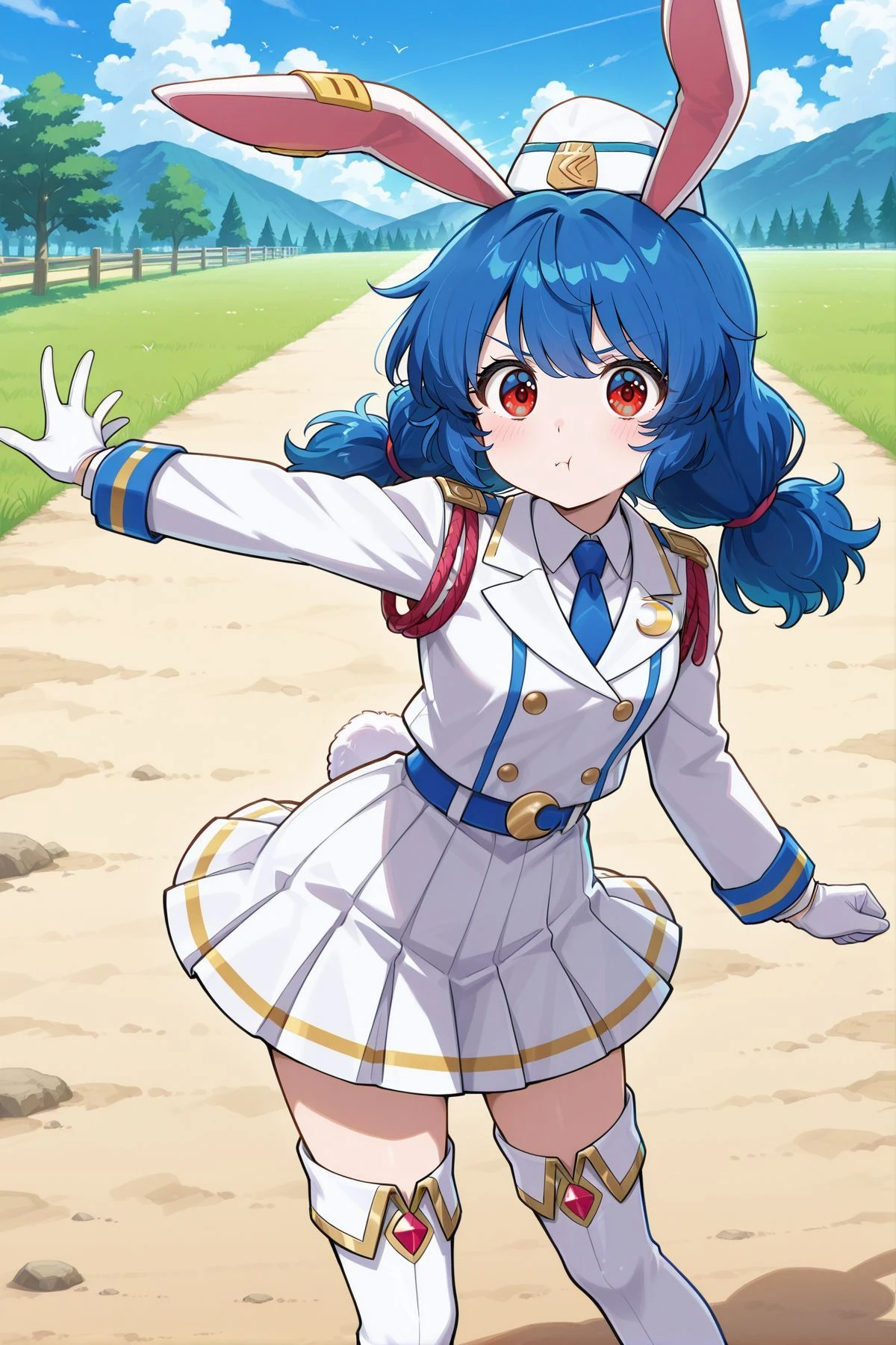 seiran, 1girl, solo, red eyes, blue hair, long hair, low twintails, rabbit ears, rabbit tail, seiran \(thought investigator of the capital\), alternate costume, earclip, crescent, spacesuit, grey suit, long sleeves, belt, grey skirt, pencil skirt, grey pantyhose, blue boots, holding helmet, seiran, 1girl, solo, red eyes, blue hair, long hair, low twintails, rabbit ears, rabbit tail, seiran \(white rabbit practical team\), alternate costume, white headwear, earclip, black necktie, military uniform, epaulettes, red chain, white jacket, collared shirt, white shirt, white gloves, pleated skirt, white skirt, white boots, high heel boots, kine, mallet,seiran, 1girl, solo, red eyes, blue hair, long hair, low twintails, rabbit ears, rabbit tail, seiran \(eagle ravi special forces\), alternate costume, earclip, green headwear, beret, crescent pin, green jacket, long sleeves, collared shirt, white shirt, red necktie, yellow skirt, pleated skirt, white socks, brown footwear, buttons, lunatic gun, holding gun, seiran, 1girl, solo, red eyes, blue hair, double bun, hair bun, rabbit ears, rabbit tail,, seiran \(codename:chive\), skinny, alternate costume, alternate hairstyle, domino mask, blue mask, earclip, star necklace, red choker, wrestling outfit, bare shoulders, blue top, cleavage, midriff, blue gloves, fingerless gloves, blue skirt, bike shorts, black shorts, fishnet thighhighs, lace-up boots, knee boots, blue boots, crescent ornament, Optional :