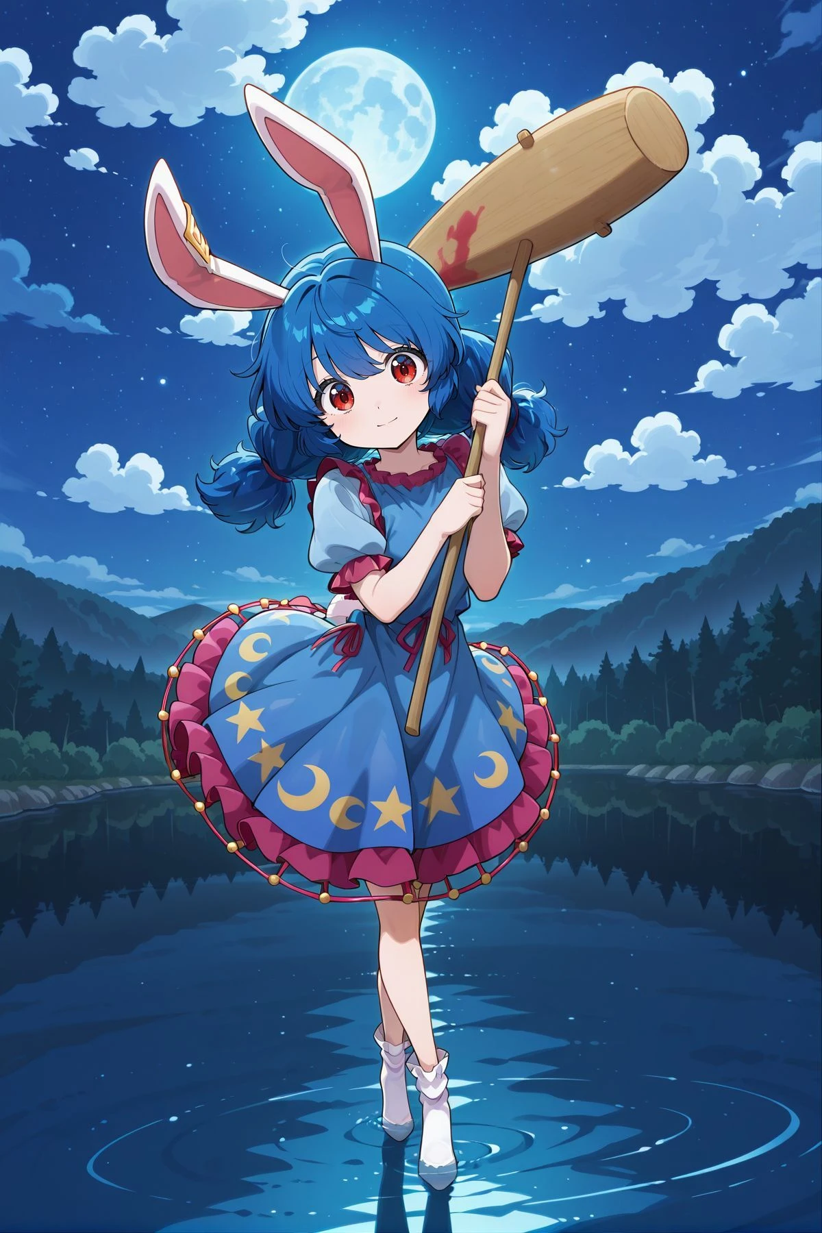 seiran, 1girl, solo, red eyes, blue hair, long hair, low twintails, rabbit ears, rabbit tail,earclip, blue dress, short sleeves, crescent print, star print, white socks, white footwear,Alternatives :