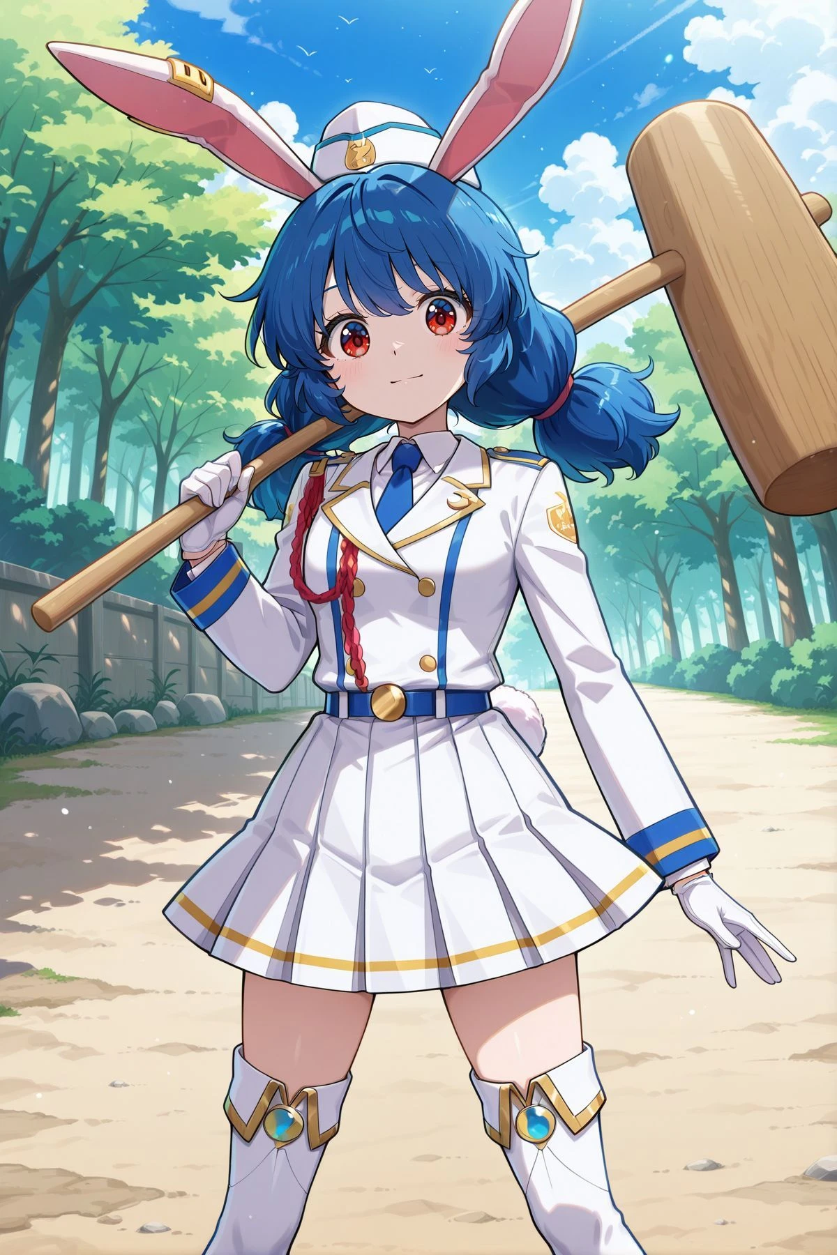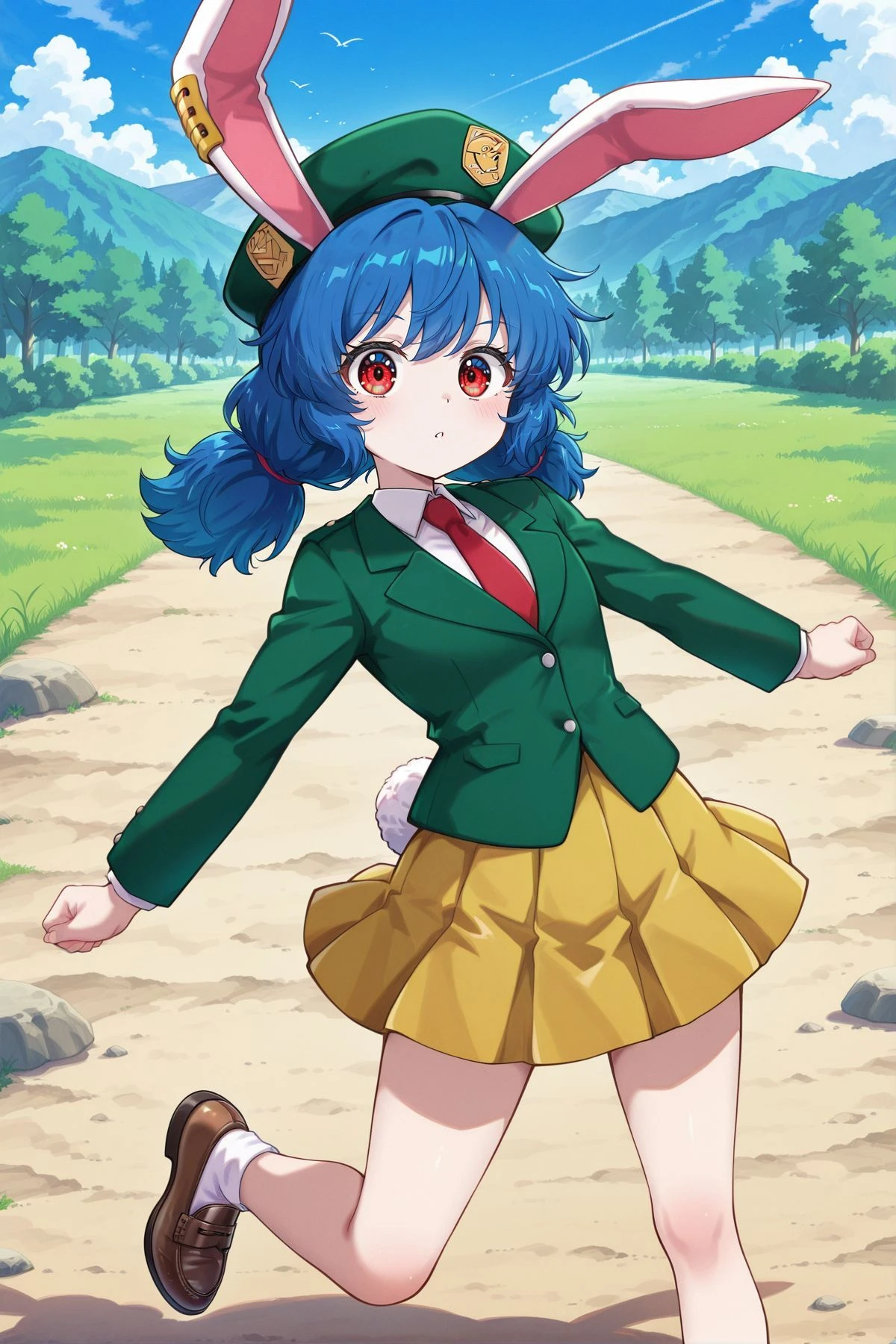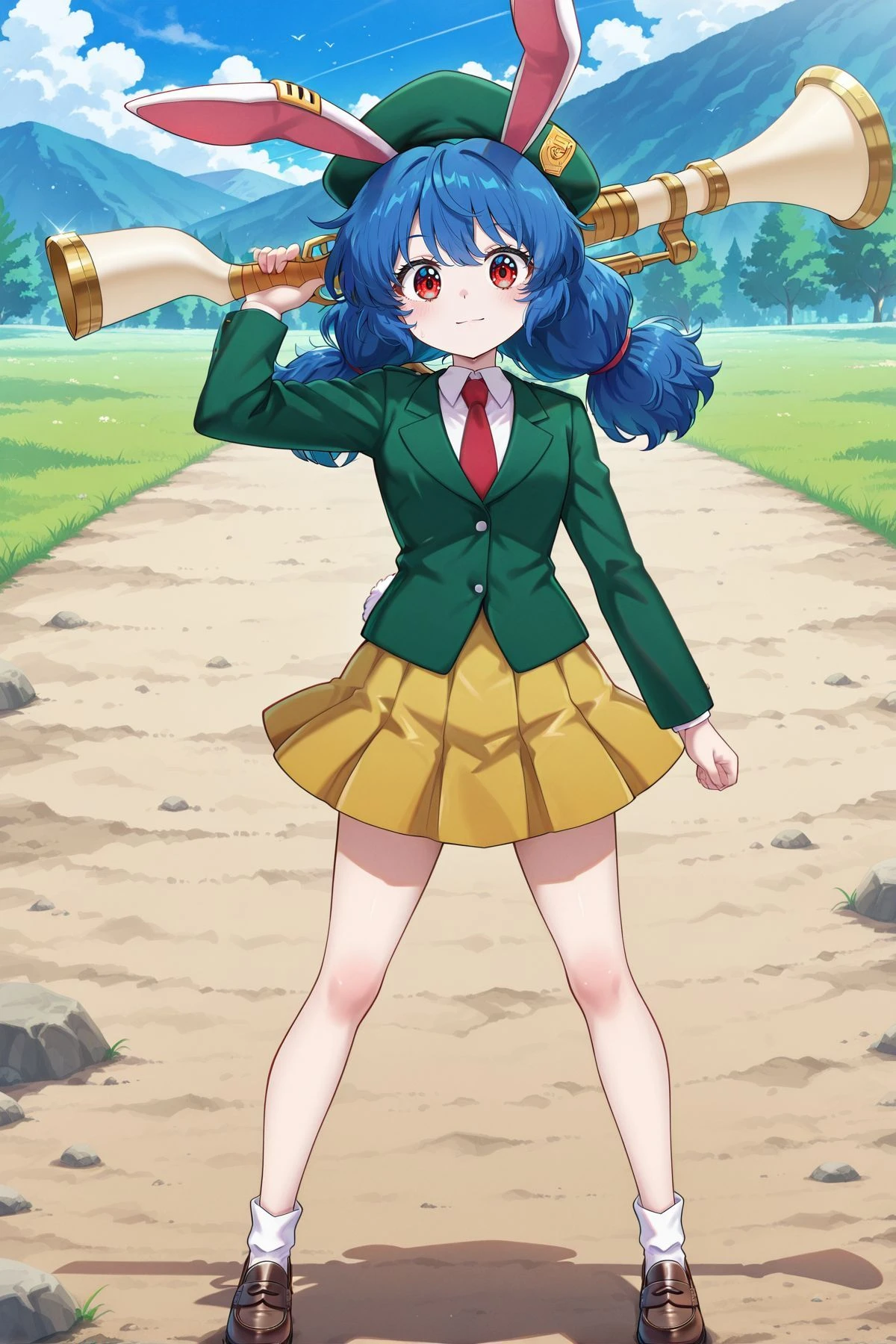 seiran, 1girl, solo, red eyes, blue hair, long hair, low twintails, braided twintails, rabbit ears, large breasts, aged up,, seiran \(overly pale blue eagle ravi\), alternate costume, yellow earclip, crescent pin, red necktie, aqua jacket, long sleeves, white shirt, collared shirt, white skirt, pleated skirt, blue socks, brown shoes, loafers, white backpack, mallet on back,Illustrious V1