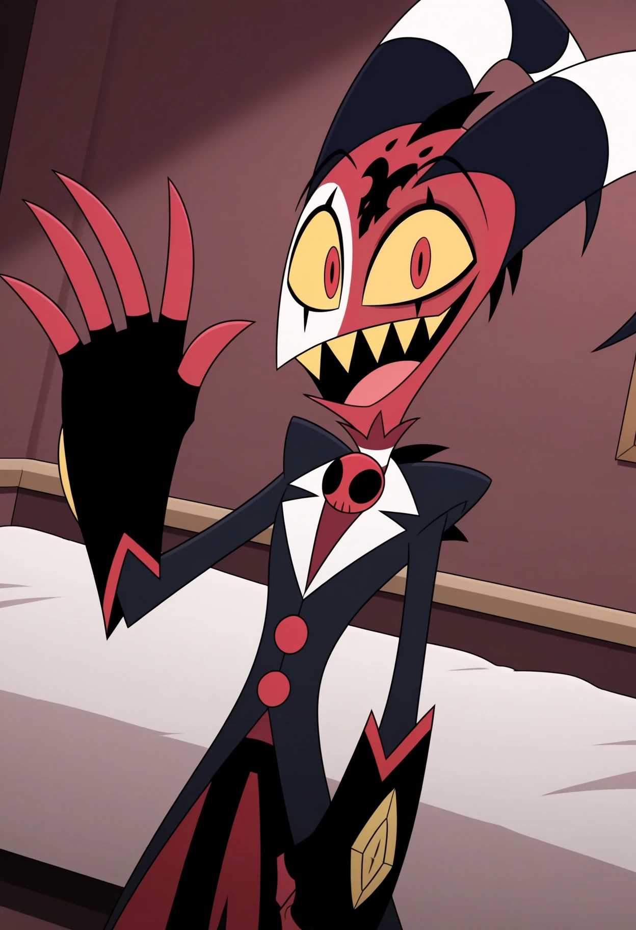 blitzohb, colored skin, red skin, red eyes, colored sclera, yellow sclera, sharp teeth, yellow teeth, white and black horns, necklace, skull necklace, tail, demon tail